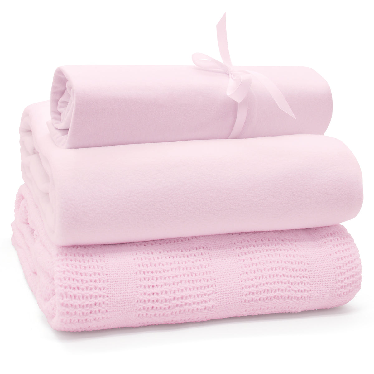 1 x Jersey Fitted Sheet 1 x Cellular Blanket 1 x Fleece Blanket |