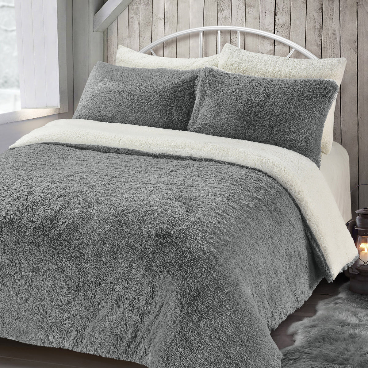 Looking for the ultimate comfort on chilly nights? Look no further than our Velosso Alaska Faux Fur Teddy Silver Sherpa Duvet Cover and Pillowcase Set. The plush fabric loops provide a super soft and snuggly addition, while the silver shade adds a luxurious touch to any neutral décor. And with its versatile design, you can switch up your look with ease - the reverse side is made in a creamy white clotted cream shade. Plus, you won't have to sacrifice convenience for comfort, as this silver teddy fleece duvet cover set is machine washable for easy care. Pillowcases are included to complete your cosy escape.