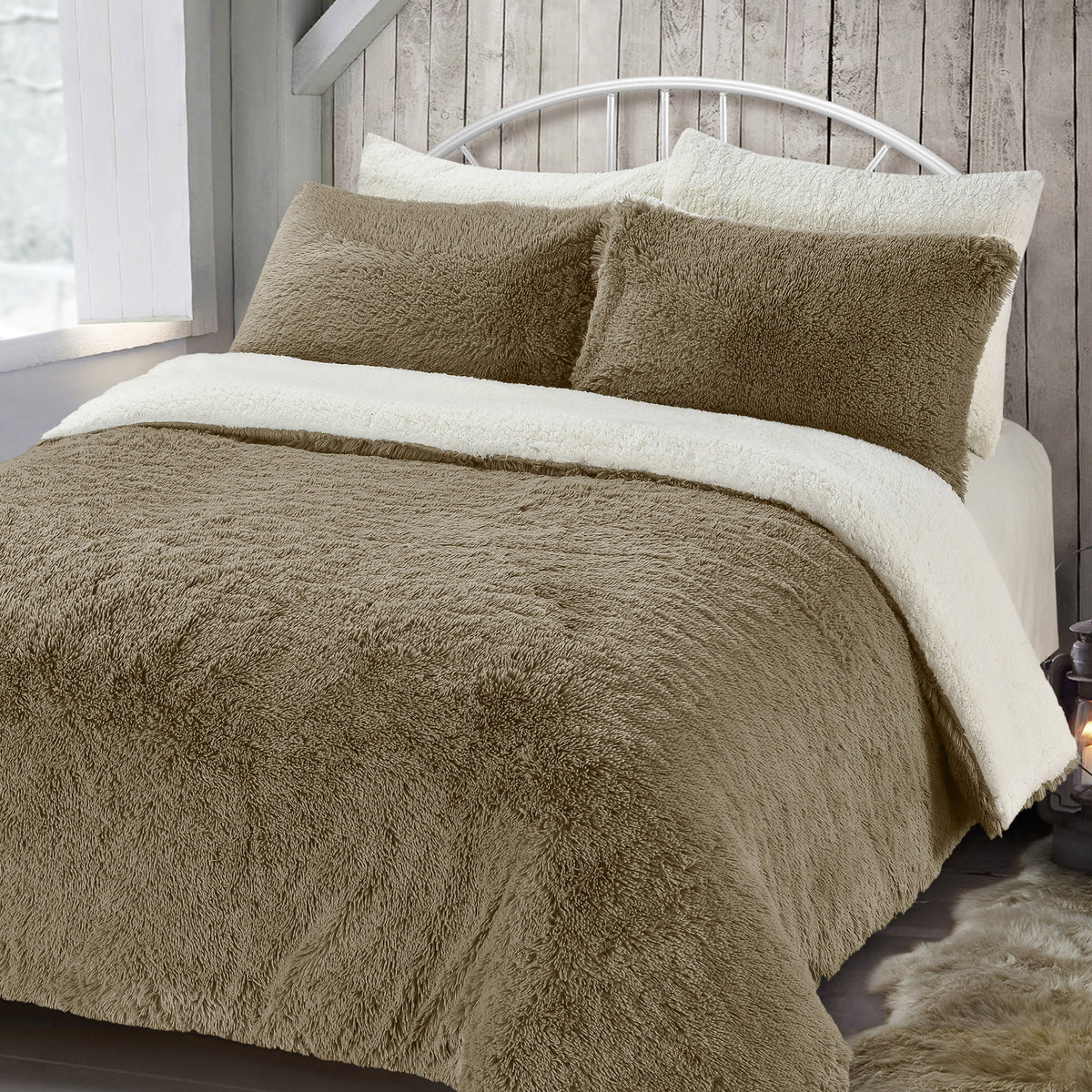 Looking for the ultimate comfort on chilly nights? Look no further than our Velosso Alaska Faux Fur Teddy Taupe Sherpa Duvet Cover and Pillowcase Set. The plush fabric loops provide a super soft and snuggly addition, while the taupe shade adds a calm and inviting touch to any neutral décor. And with its versatile design, you can switch up your look with ease - the reverse side is made in a creamy white clotted cream shade. Plus, you won't have to sacrifice convenience for comfort, as this taupe teddy fleece duvet cover set is machine washable for easy care. Pillowcases are included to complete your cosy escape.