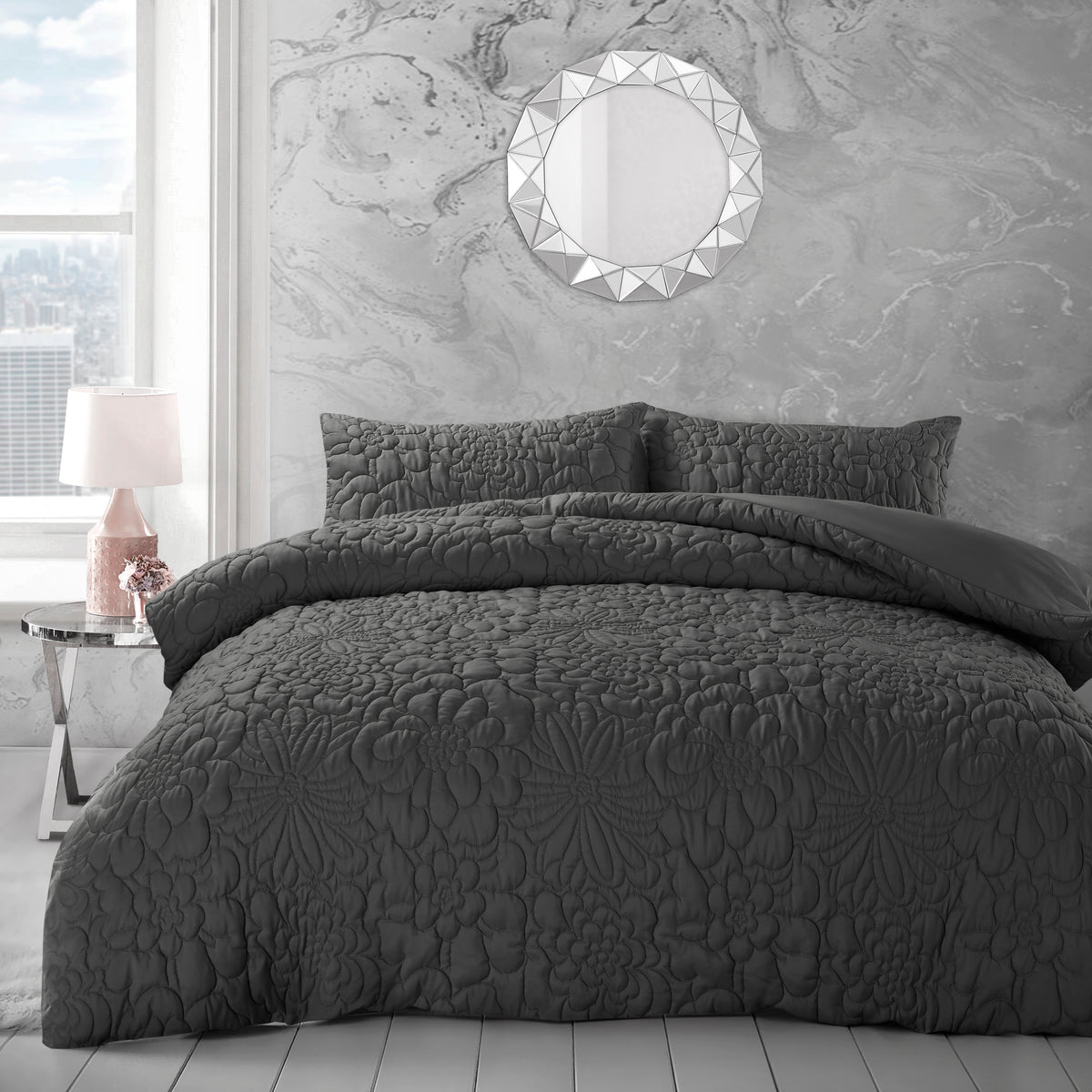Bring a touch of royalty to your bed with our Velosso Alini Floral Embossed Dusky Duvet Cover and Pillowcase Set. This contemporary set is an epitome of style and comfort, featuring a well-plumped and quilted duvet cover with an embossed design that will elevate the appearance of your bedroom. The entire breadth of the embossed charcoal duvet cover is adorned with a stunning pinsonic floral design that is both classic and on-trend. The bedding will drape beautifully on your bed, adding texture and depth to your sleep sanctuary. And with its machine-washable and easy-to-care-for microfibre fabric, you can enjoy a cosy night's sleep all year round without sacrificing convenience.