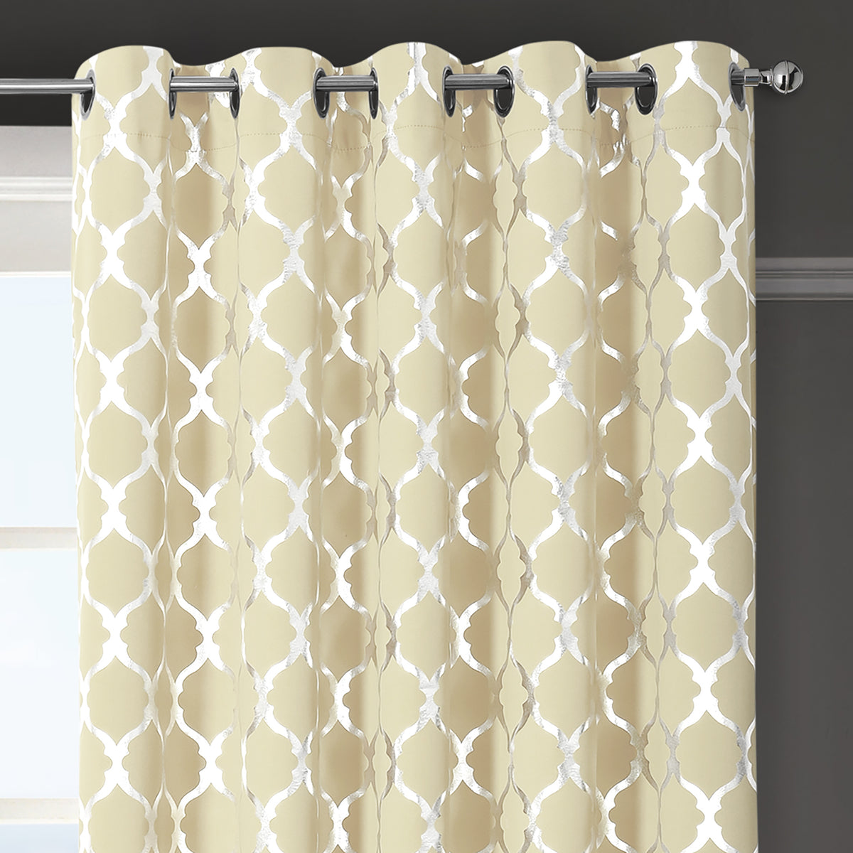Transform your bedroom into a sanctuary of peace and tranquillity with Velosso Arabesque Cream Thermal Blackout Ready Made Eyelet Curtains. Designed to block out every ounce of light, these curtains come with a blackout lining that extends all the way to the edges, making sure you get the best sleep possible. The stylish cream backdrop is adorned with a stunning silver foil metallic geometric print in an arabesque pattern, lending a touch of contemporary luxury to any room.