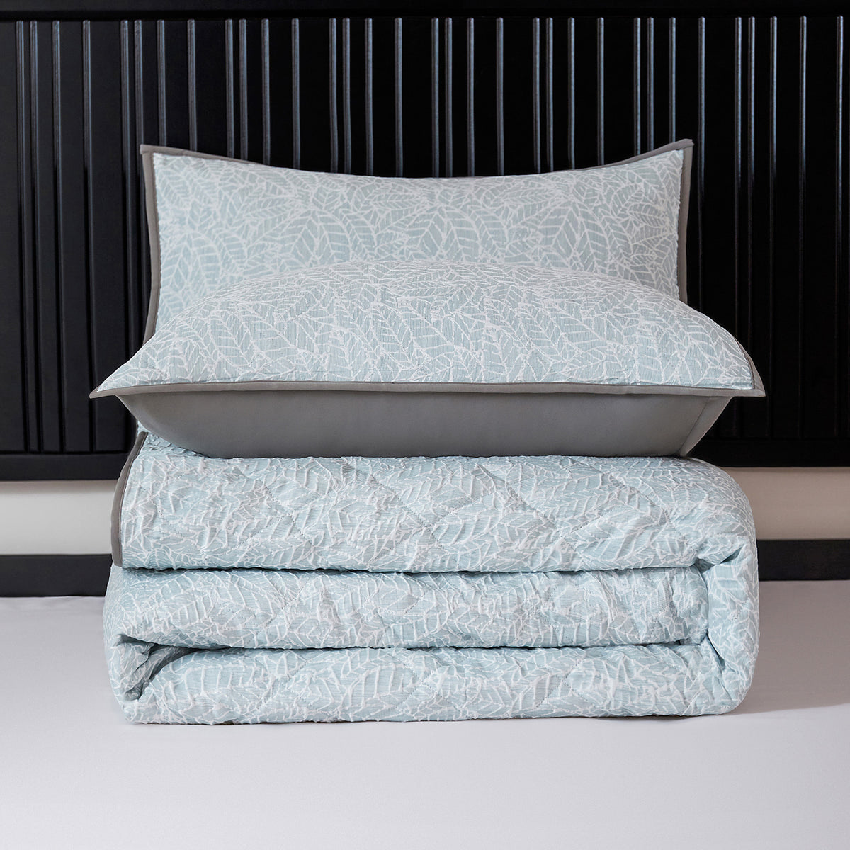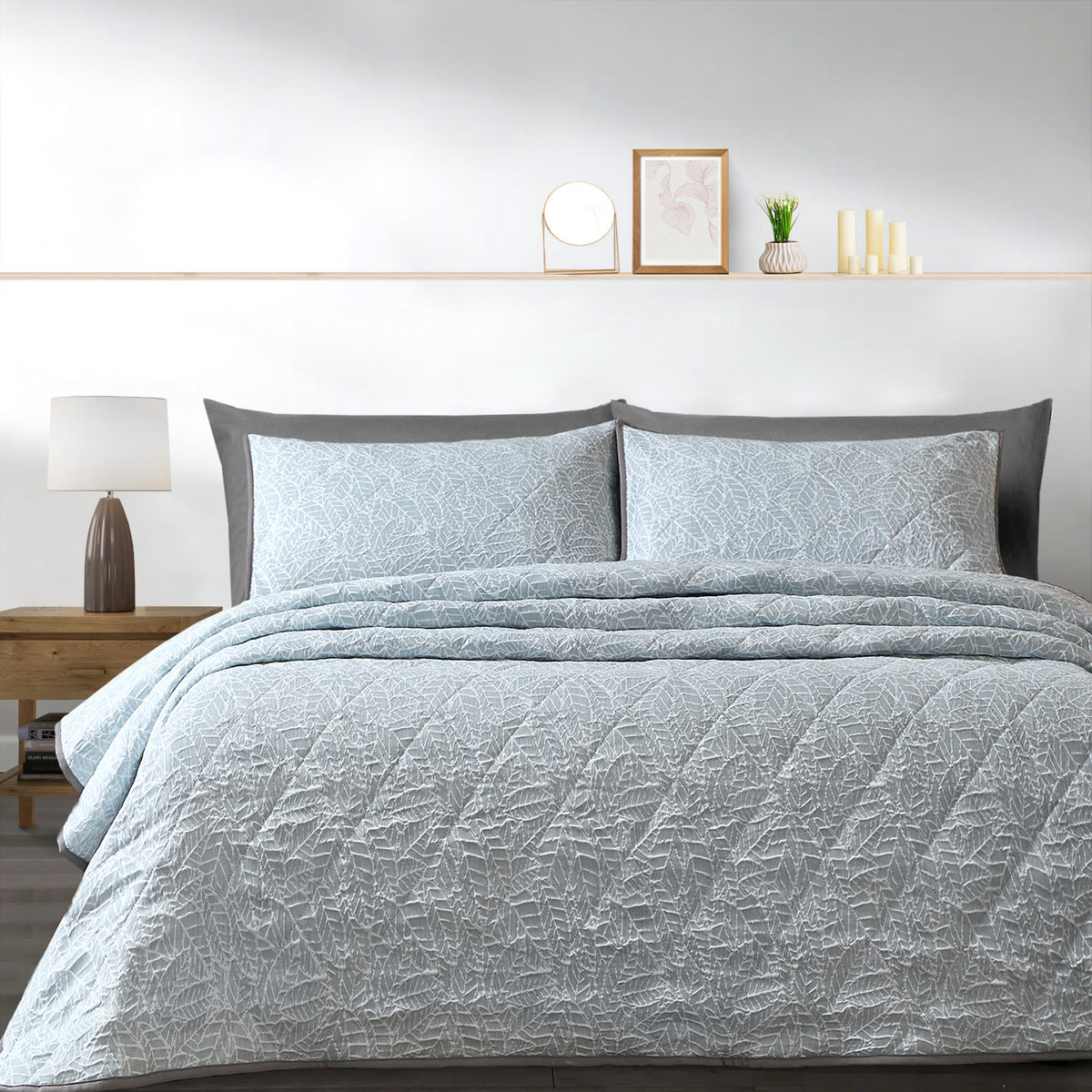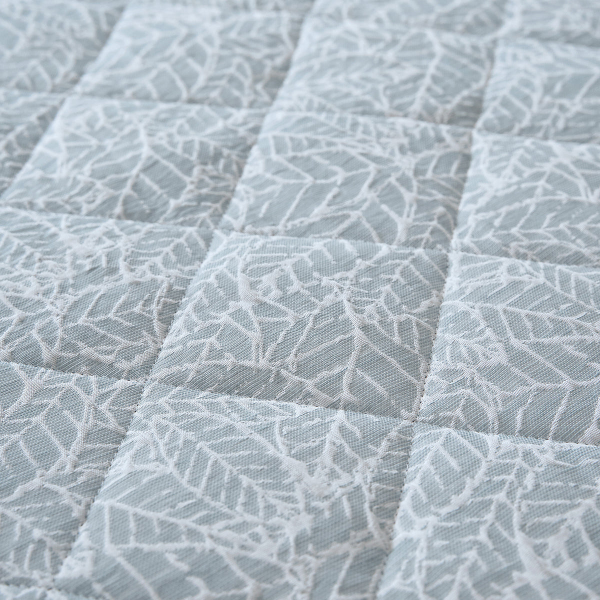 Our Velosso Luxury Jacquard Quilted Duck Egg Bedspread Set is a harmonious blend of contemporary style and timeless luxury. Featuring a stunning modern leaves design in a captivating duck egg colourway, this bedspread set is designed to elevate the ambiance of your bedroom with its exquisite charm.