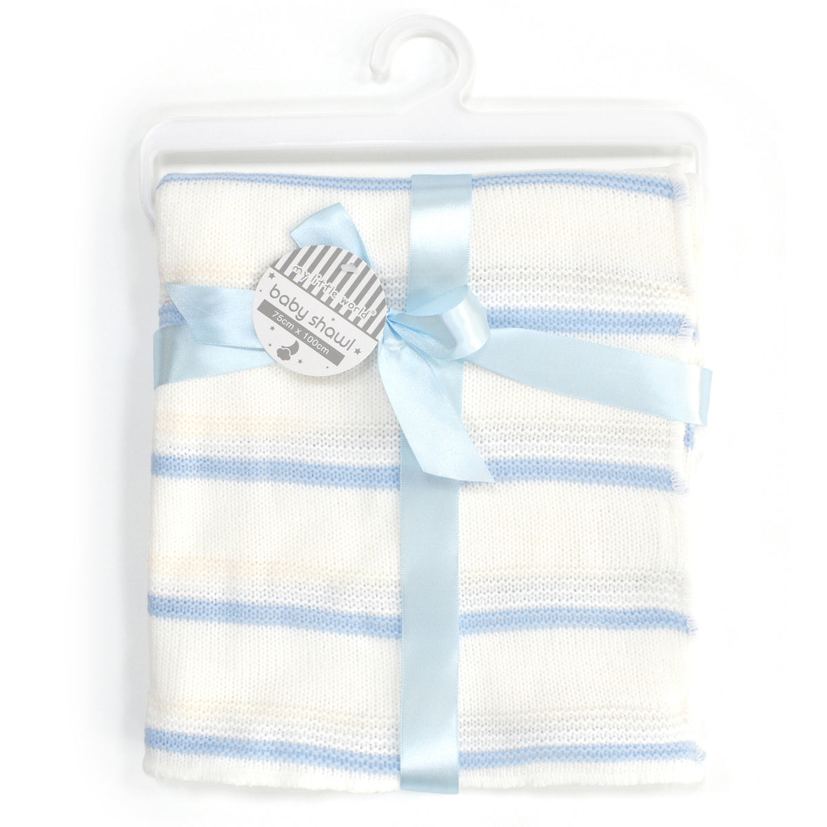 Looking for a stylish and cosy baby shawl? Look no further than our My Little World Blue Stripe Knitted Baby Shawl. A gorgeous white and blue striped shawl made with the utmost care and attention to detail, this shawl is perfect for keeping your baby warm and snug. Featuring a detailed woven and ribbed pattern, this shawl is both smart and cute, making it the perfect addition to any baby's wardrobe. Whether you're using it in a Moses basket or a cot, this blue stripe knitted shawl is sure to provide your little one with the ultimate comfort.