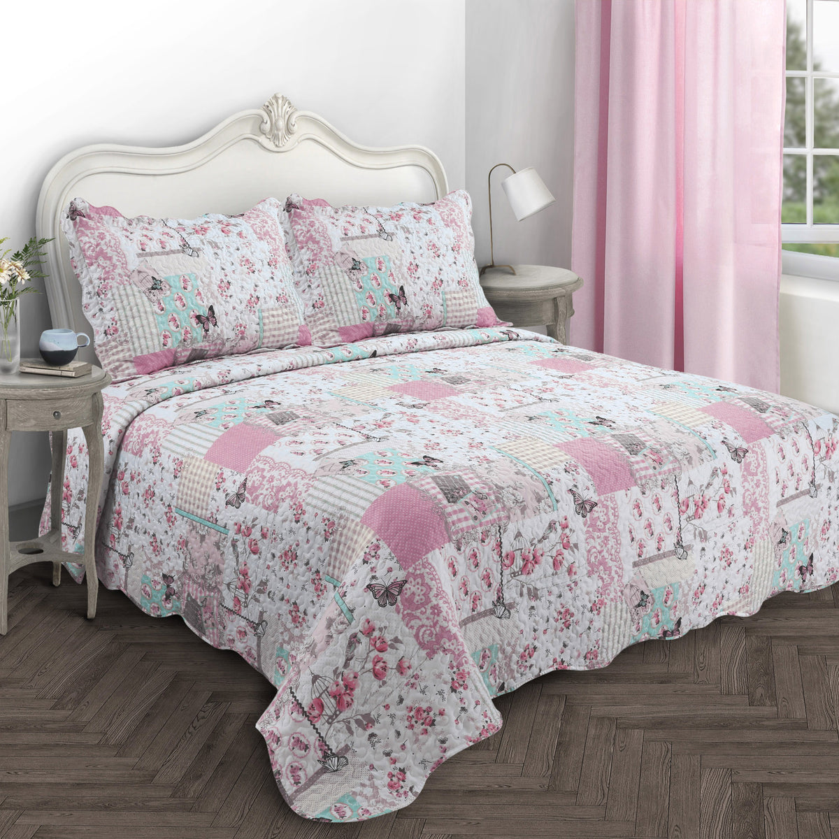 Bedspreads are always in style and a chic addition to your sleep space. Our patchwork bedspread features a fusion of soft pastel pinks, blues, grey and white, as well as fluttering grey butterflies, birdcages, stamps, and a mix of patterns like stripes, flowers, polka dots and checks.