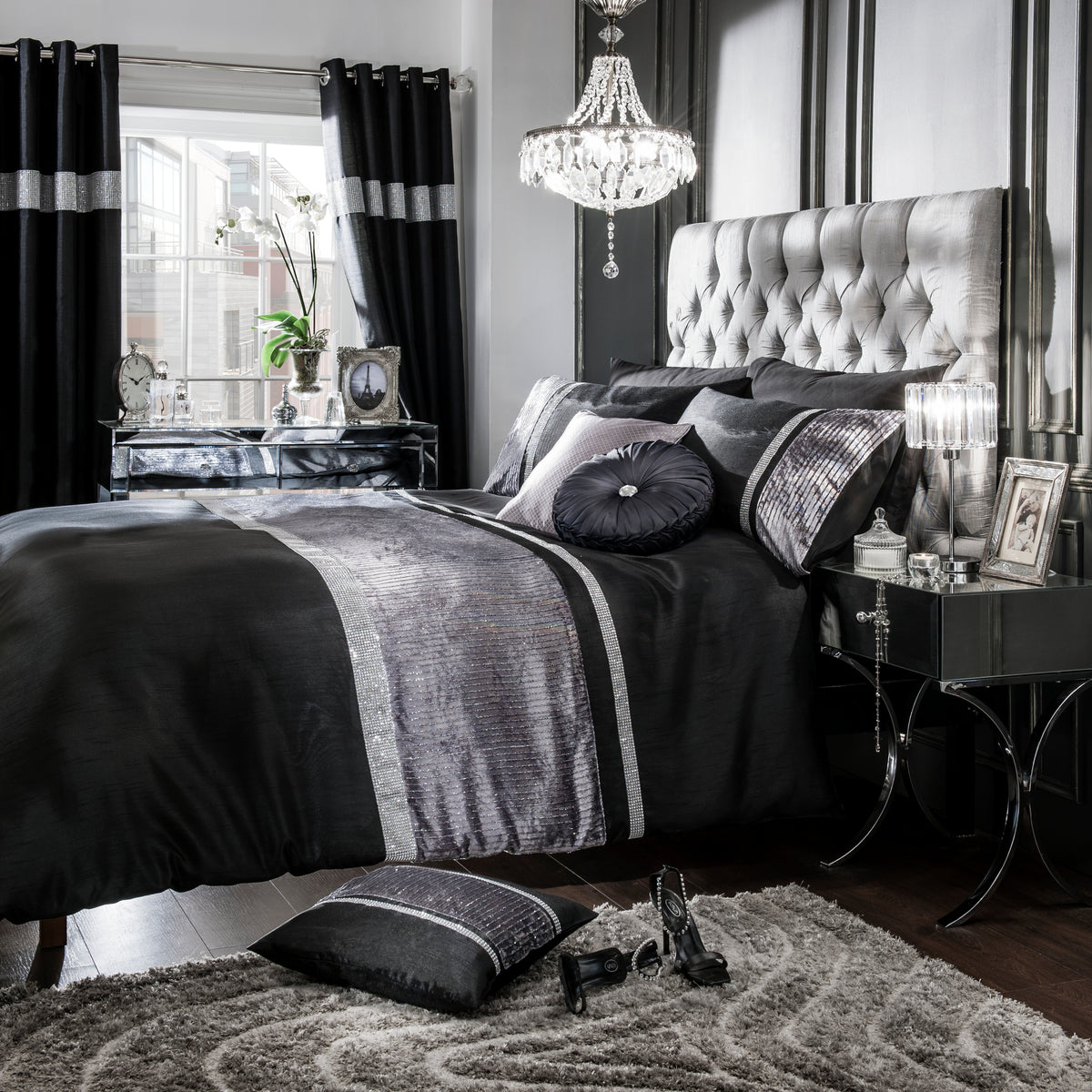 Make a bold statement in your bedroom with our Intimates Chanelle Diamante Black Crushed Velvet Bedding Set. This black duvet set features a luxurious velvet panel at the top, embellished with intercut designs of sparkling silver strips against a sleek grey velvet background.
