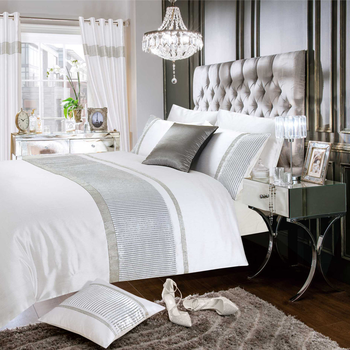 Indulge in a luxurious night's sleep with our Intimates Chanelle Crushed Velvet White Duvet Cover and Pillowcase Set, featuring a contemporary velvet stripe with shimmering glitter sparkles. Adorned with generous silver vertical strips that shimmer and shine, the soft-touch velvet panel is elevated with a dazzling silver diamanté lace.