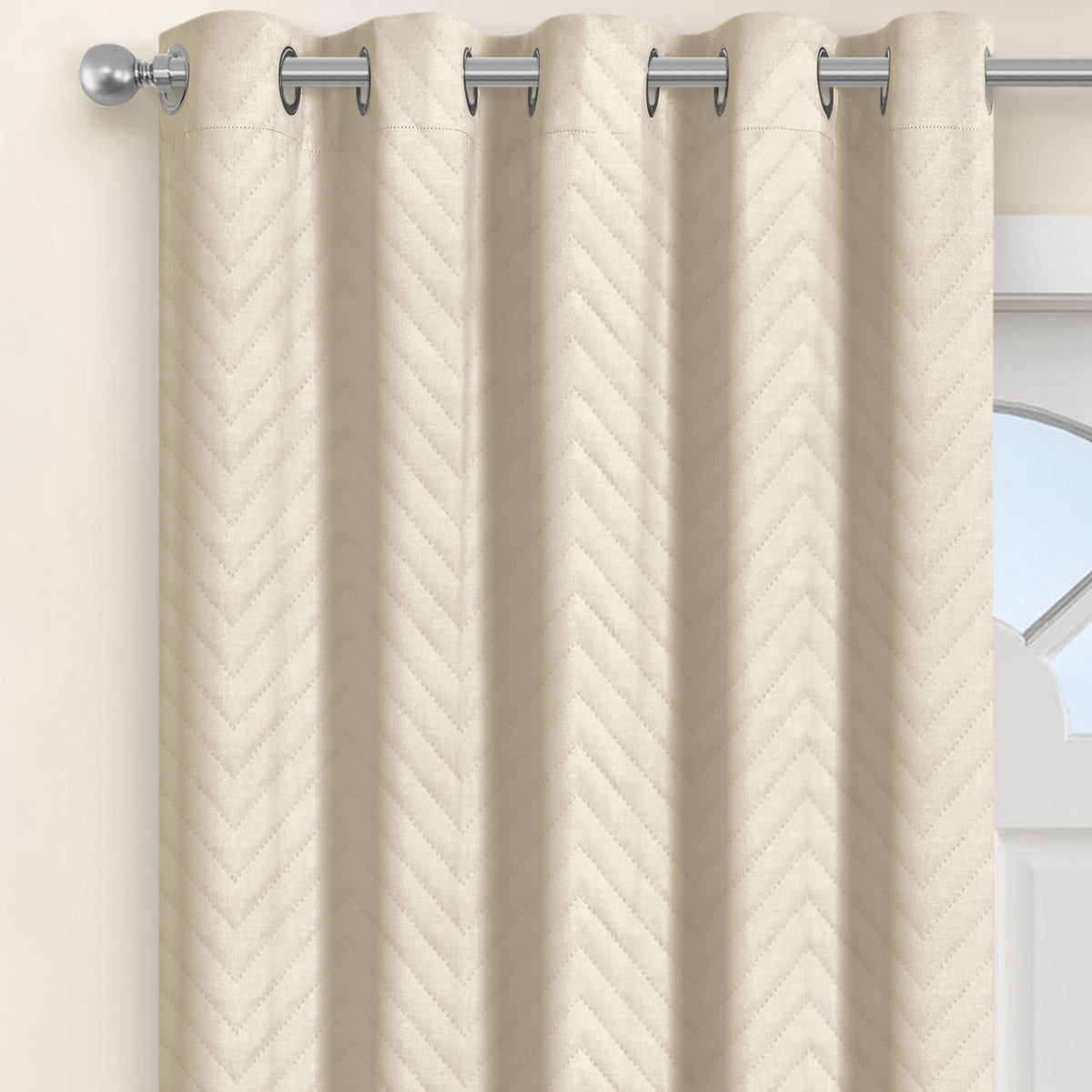 Revamp your home effortlessly with our Velosso Chevron Cream Thermal Door Curtain. This curtain boasts an elegant and timeless cream shade, which exudes sophistication and style. With a thick embossed finish and a chevron pin sonic design print, this luxury curtain is perfect for those who want a semi-plain curtain with a hint of self-print design.