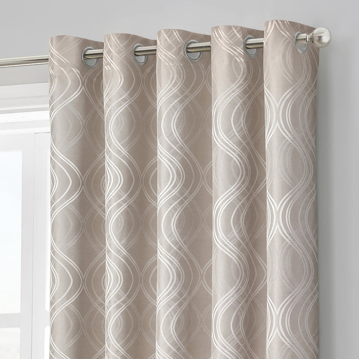Transform your living space with our Velosso Clarissa Beige Jacquard Ready Made Eyelet Curtains. The classic shade of beige suits any home décor style and the heavenly woven jacquard design will elevate the elegance of your room. The glamorous swirls intertwine in a sophisticated white shade, creating a stunning contrast against the beige backdrop.