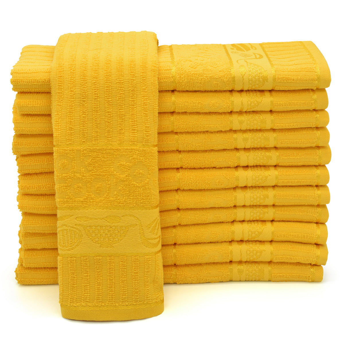 Looking for a tea towel that's both functional and stylish? Look no further than our Kitchen Trends Cooks Jacquard Ochre Yellow Tea Towel. Made from 100% pure cotton, this high-quality tea towel boasts a stunning chef-themed design that is both elegant and practical. Featuring a pretty border of cooking utensils and ribbed texture with borders of designs, this tea towel is sure to impress.