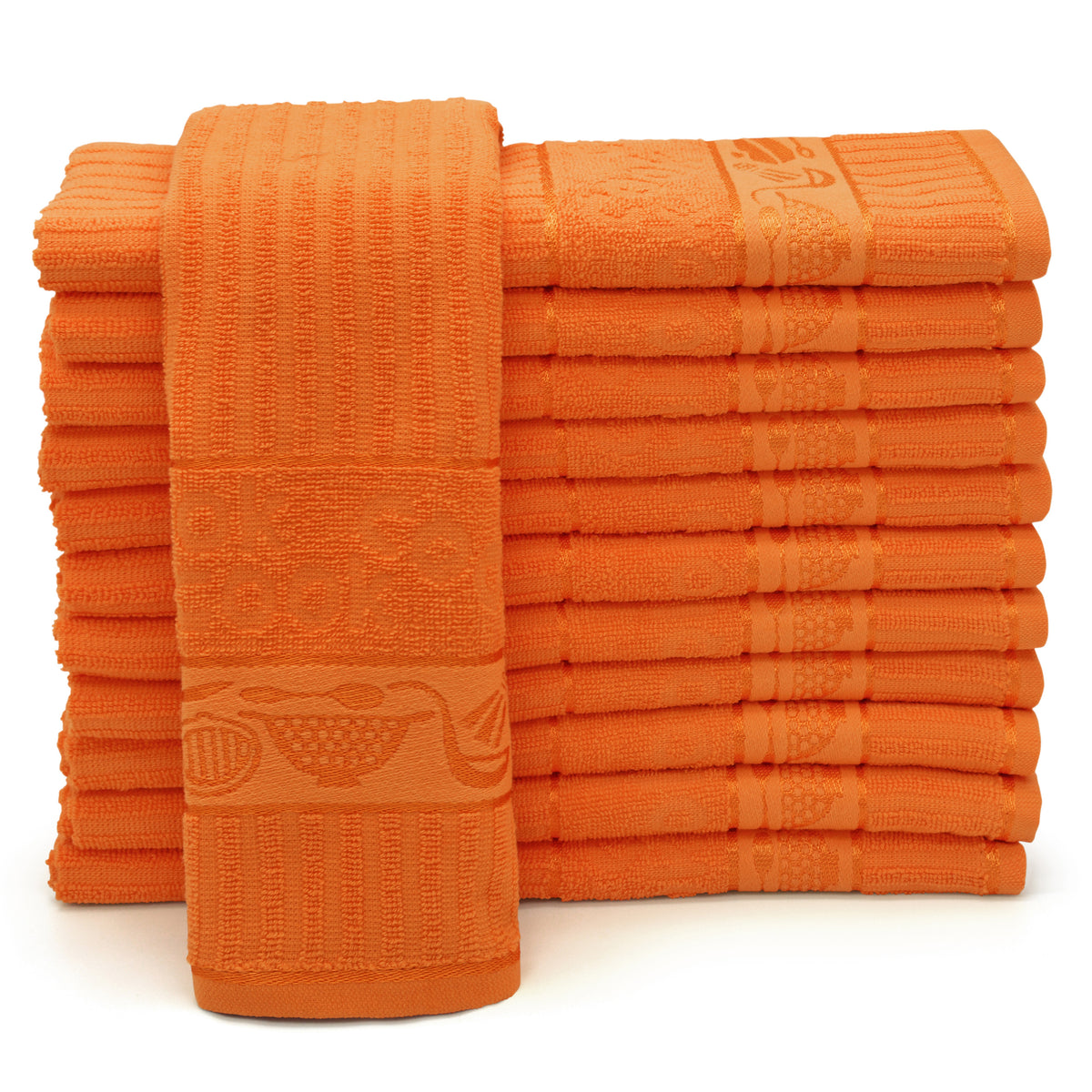 Looking for a tea towel that's both functional and stylish? Look no further than our Kitchen Trends Cooks Jacquard Orange Tea Towel. Made from 100% pure cotton, this high-quality tea towel boasts a stunning chef-themed design that is both elegant and practical. Featuring a pretty border of cooking utensils and ribbed texture with borders of designs, this tea towel is sure to impress.