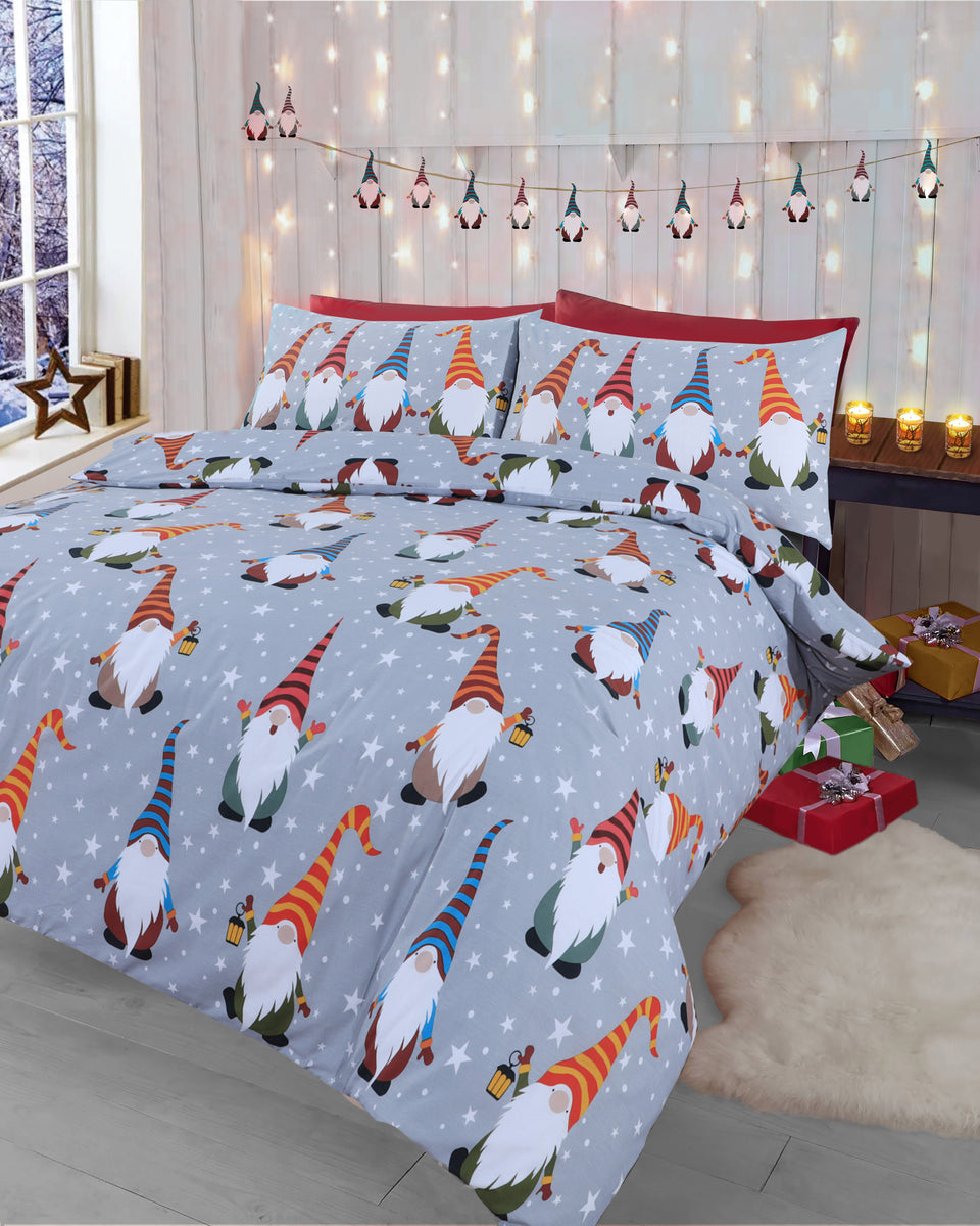 Introducing our charming Poly Cotton Gonks Printed Duvet Cover Set – a delightful addition to your bedroom decor that brings festivity and style to your space. This set showcases a playful Gonks design against a soothing grey background adorned with scattered stars, creating a dreamy atmosphere that's perfect for both adults and children alike.