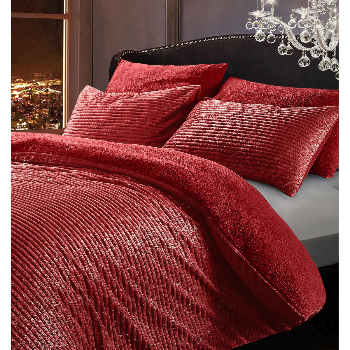 Featuring a striking red corduroy front generously embellished with silver glitter, this duvet cover set is a total game changer when it comes to glamming up your bedroom décor. The reverse side is made from super-soft red flannel fabric that offers an absolute luxury sleep experience. Its optimum softness will guarantee you a perfectly snug night's sleep every time. This stunning iconic shade of red will give your room an instant sophisticated, plush look that's perfect for the festive season.