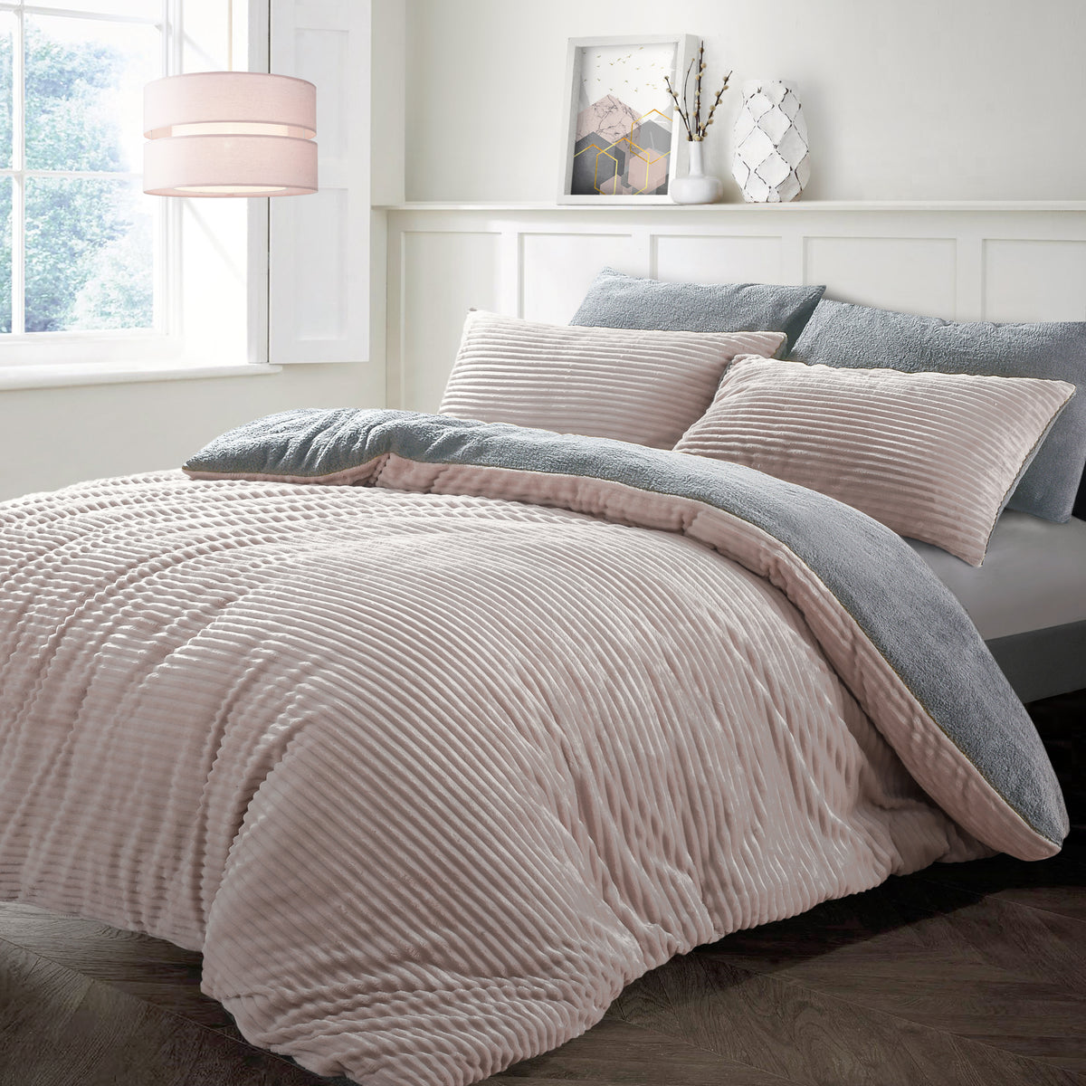 Introducing the ultimate cosy companion for your bed; a luxurious duvet set with matching pillowcases. The reverse side features a soft, plain grey flannel fabric that will cocoon you in comfort and keep you warm on chilly nights. The front is crafted from premium corduroy fabric in a soft blush pink hue, with tufted cords adding texture and durability.