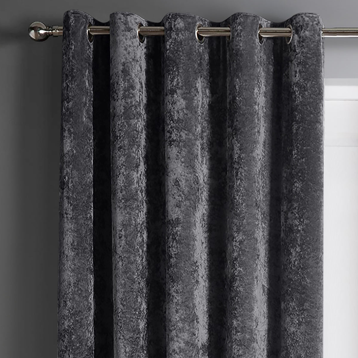 Introduce a sense of sleek sophistication and fashionable décor to your home with our Intimates Charcoal Crushed Velvet Ready Made Eyelet Curtains. The charcoal shade makes these curtains a statement piece that will instantly enhance any room. The luscious crushed velvet material is super soft and luxurious, with a natural sheen that shimmers against natural light. The quality velvet is twisted whilst wet to achieve this crushed look, adding an elegant touch to your décor.