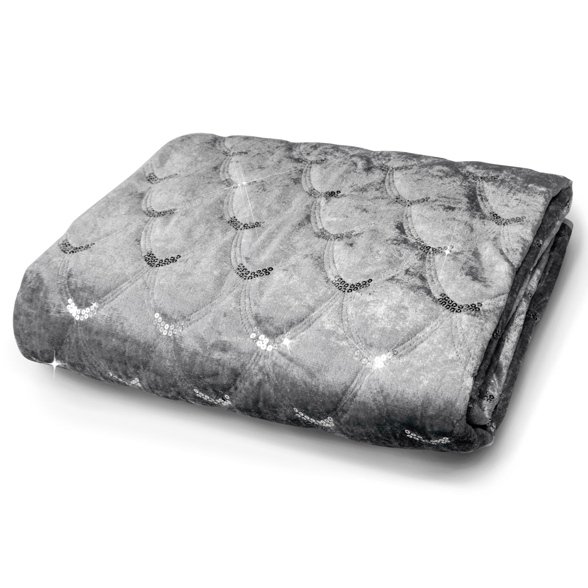 Superior quality crushed Velvet throw with a sequin detailing across the entire breadth of this throw, a beautiful natural sheen/shimmer on this quality velvet fabric that sparkles against natural and artificial lighting. This quality throw has a plush and exquisite feel to it, it is super-soft and smooth with a luxurious feel. This throw is a must for all those of you, who enjoy a snug and warm cosy feeling. Made in a gorgeous contemporary silver shade with similar sequins, the perfect addition to your room decor.