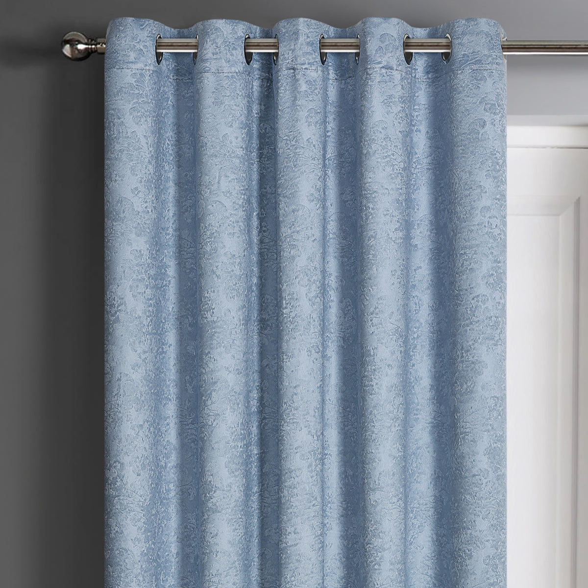 This bright and vibrant shade of blue door curtain is sure to bring some colour and sophistication to your room décor. A traditional damask design on a polyester embossed fabric that is textured. Made with a modern silver chrome eyelet header for your convenience and ease. This door curtain is great for all year-round use. Dim-out series provides increased privacy blocking out unwanted draught keeping your room cool during summer also eliminates cold draughts from entering during winter resulting in the energy efficiency with triple layered fabric, Dim-out series also reduces outside noise, innovative high density yarn ensure light is filtered as well as blocking harmful uv-rays . Energy efficient, reduces noise, Uv rays protection, eliminates draught, Thermal and Dim-out. Measurements stated width x drop. Machine washable. ONE CURTAIN PANEL ONLY.