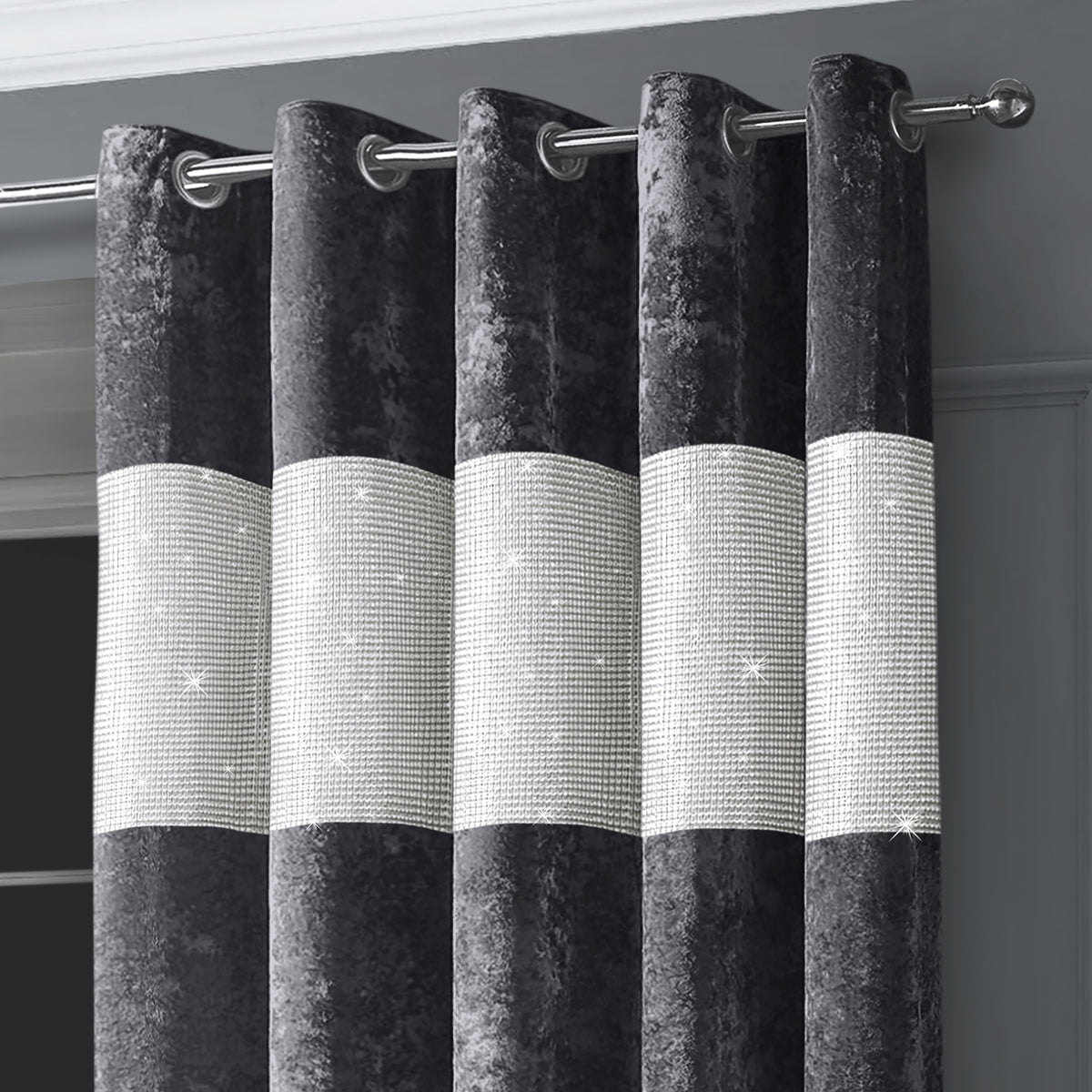 These curtains are perfect for all year-round use, regardless of the season, and are ready-made for your convenience. The chrome eyelet header allows for effortless installation on your curtain pole, while the smooth gliding forms perfect folds and drape. Fully lined for extra warmth and privacy, these curtains are the epitome of luxury and glamour. Unwrap and install them straight onto your curtain pole, and let the magic of our Intimates Diamante Charcoal Crushed Velvet Ready Made Eyelet Curtains transform your space.