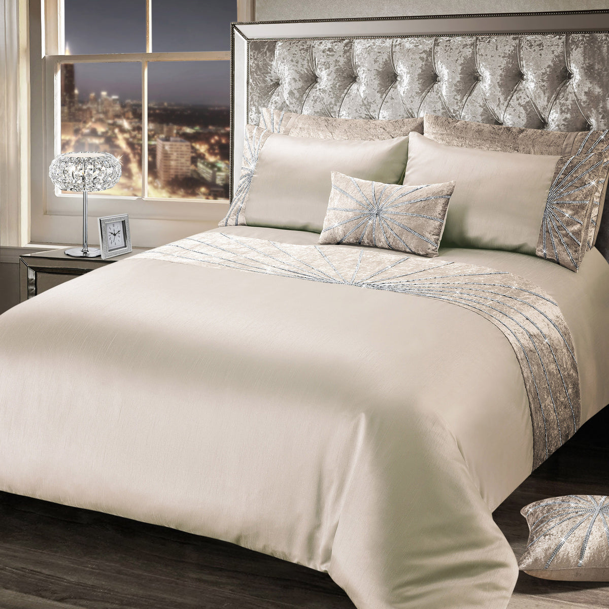 This soft natural duvet set is machine washable, making it a practical and elegant addition to your bedding collection. Each crushed velvet diamante starburst duvet set contains a duvet cover and matching pillow cases.