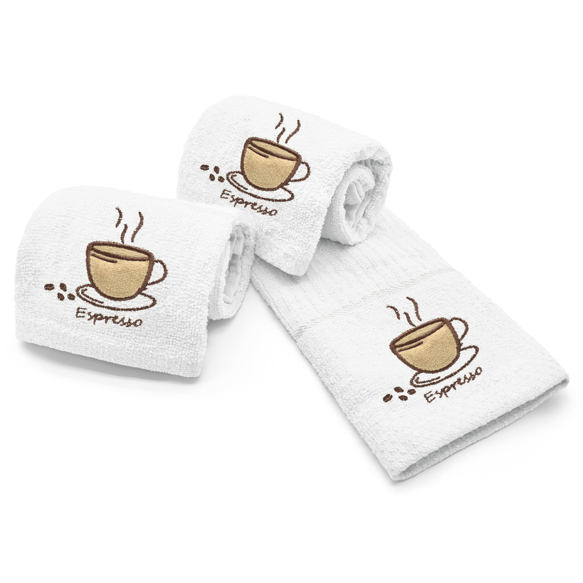 Update your kitchen with our Kitchen Trends White Espresso Tea Towel, made from 100% pure cotton for unbeatable quality. Featuring a ribbed texture and a charming coffee cup and saucer design on the border and a white background, this tea towel is both stylish and practical.