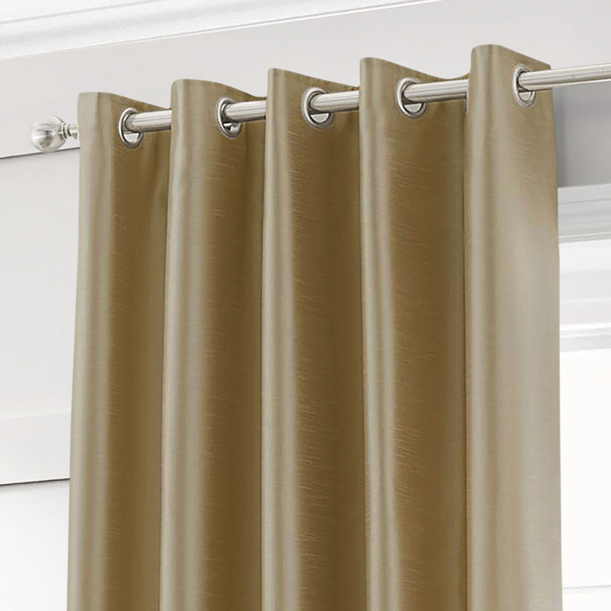 Upgrade your home décor with our Velosso Latte Faux Silk Eyelet Curtains, the perfect way to refresh your living space without breaking the bank. These luxurious cream-colored curtains are crafted from a high-quality faux silk fabric that exudes elegance and sophistication, adding a touch of glamour to any room. The fabric's natural shimmer beautifully reflects both natural and artificial lighting, giving your space a luminous and radiant feel.