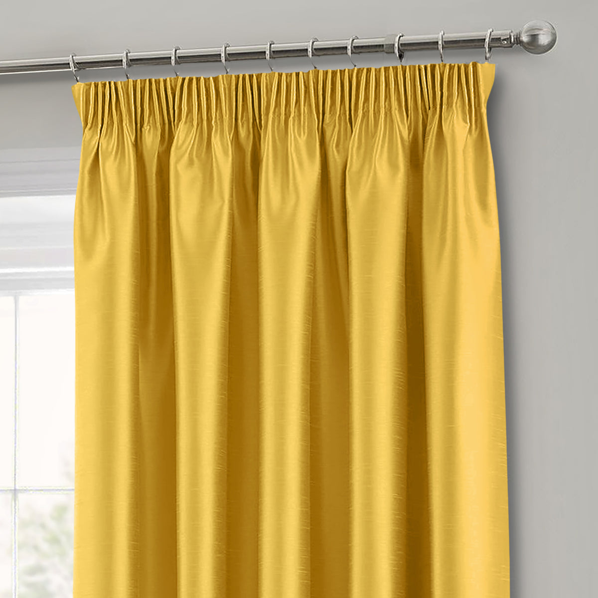 Revamp your home décor with our Intimates Faux Silk Ochre Pencil Pleat Curtains, exuding luxury and style in a vibrant shade of ochre. These curtains are a smart and charming choice for all seasons, perfect for elevating any room's look and feel. The quality faux silk fabric is durable, fade-resistant, and machine washable, with little to no ironing required, making it a low-maintenance option. The natural lustrous sheen of the fabric, when hit by light, creates a glistening effect that's sure to impress.