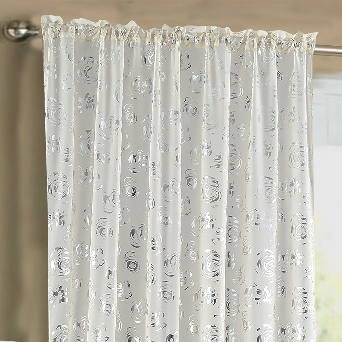 Upgrade your home décor with our Velosso Geneva Cream Slot Top Voile Panel. This stunning curtain panel will add a touch of glamour and vibrancy to your space while providing you with privacy. Made from high-quality voile fabric, this voile curtain features a dazzling metallic silver foil print of swirling flowers against a striking cream backdrop, making it a perfect addition to any room. The versatility of this voile curtain panel allows you to style it in endless ways to achieve your desired look.
