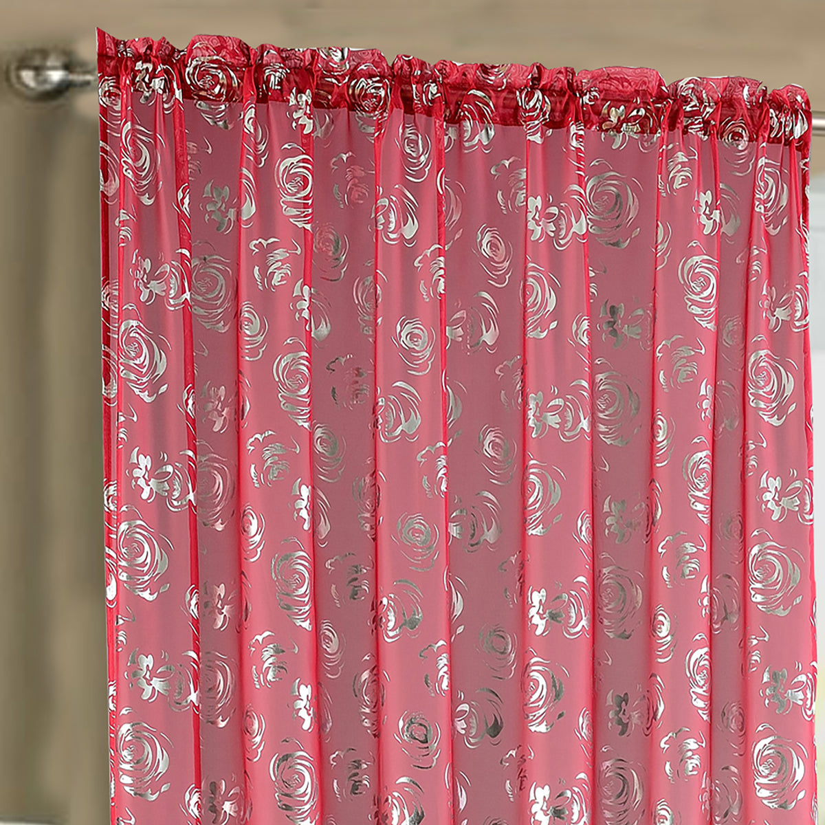 Upgrade your home décor with our Velosso Geneva Red Slot Top Voile Panel. This stunning curtain panel will add a touch of glamour and vibrancy to your space while providing you with privacy. Made from high-quality voile fabric, this voile curtain features a dazzling metallic silver foil print of swirling flowers against a striking red backdrop, making it a perfect addition to any room. The versatility of this voile curtain panel allows you to style it in endless ways to achieve your desired look.