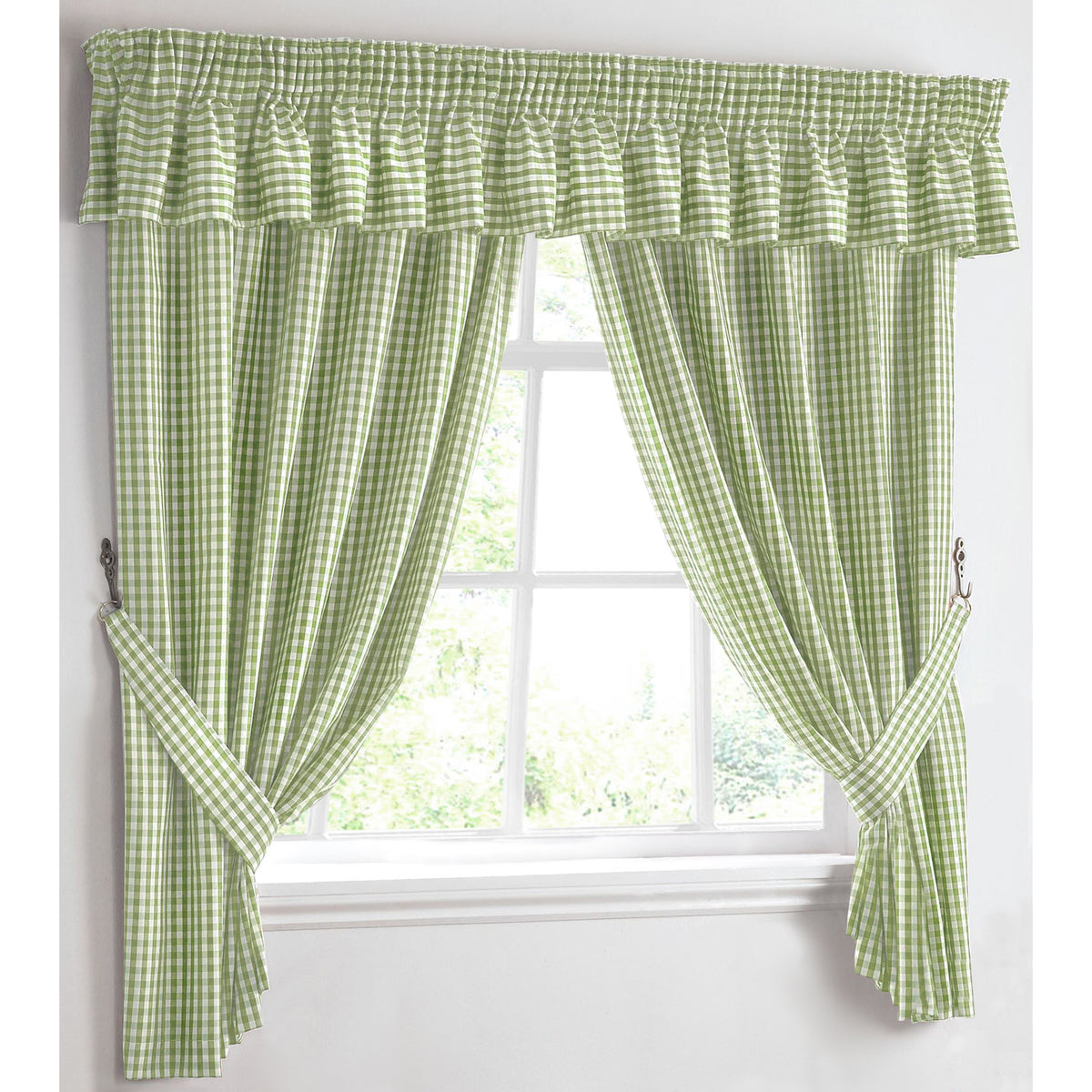 Update your kitchen with our Kitchen Trends Gingham Check Green Kitchen Curtains. These curtains are not only practical but also stylish, featuring a classic gingham check design in a beautiful shade of green. Each set contains one pair of curtains and two matching tiebacks, making it easy to open and close your curtains as needed.
