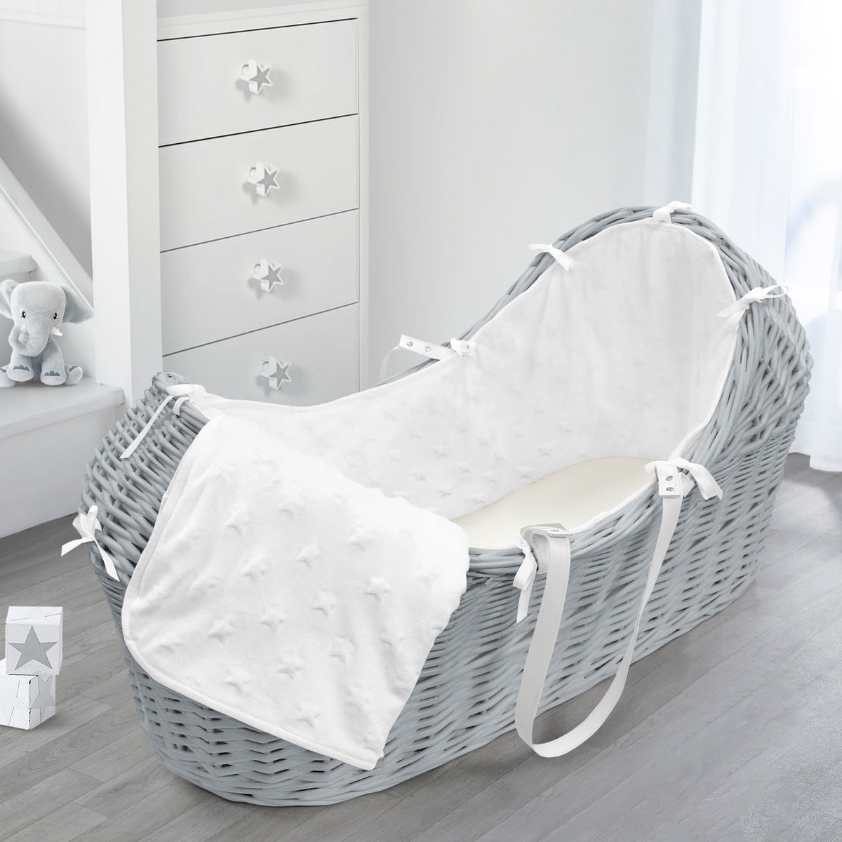 This adorable grey Pod Moses Basket with white star dressing is designed to keep your little one calm and peaceful during those precious moments of sleep. Its beautiful pod design with cute satin ties offer both comfort and style. Dressed with a super-soft popcorn dresser that is luxurious and exquisite looking. The perfect addition to your baby's nursery.