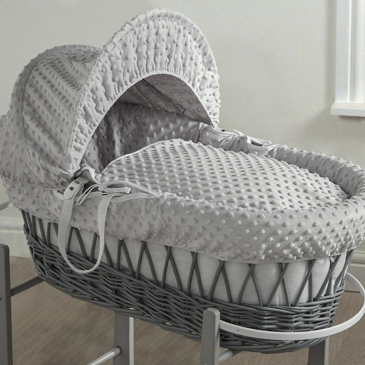 This adorable grey wicker basket with grey popcorn dressing Pod Moses Basket is designed to keep your little one calm and peaceful during those precious moments of sleep. A carefully crafted pod design with cute panache satin ties offers comfort and style in one. Dressed with a soft quilted liner, mattress, gorgeous quilted coverlet, this would make a perfect addition to your baby's nursery. Our wicker pod has faux leather handles which allow for easy transportation between rooms, ensuring your baby remains undisturbed in their slumber.
