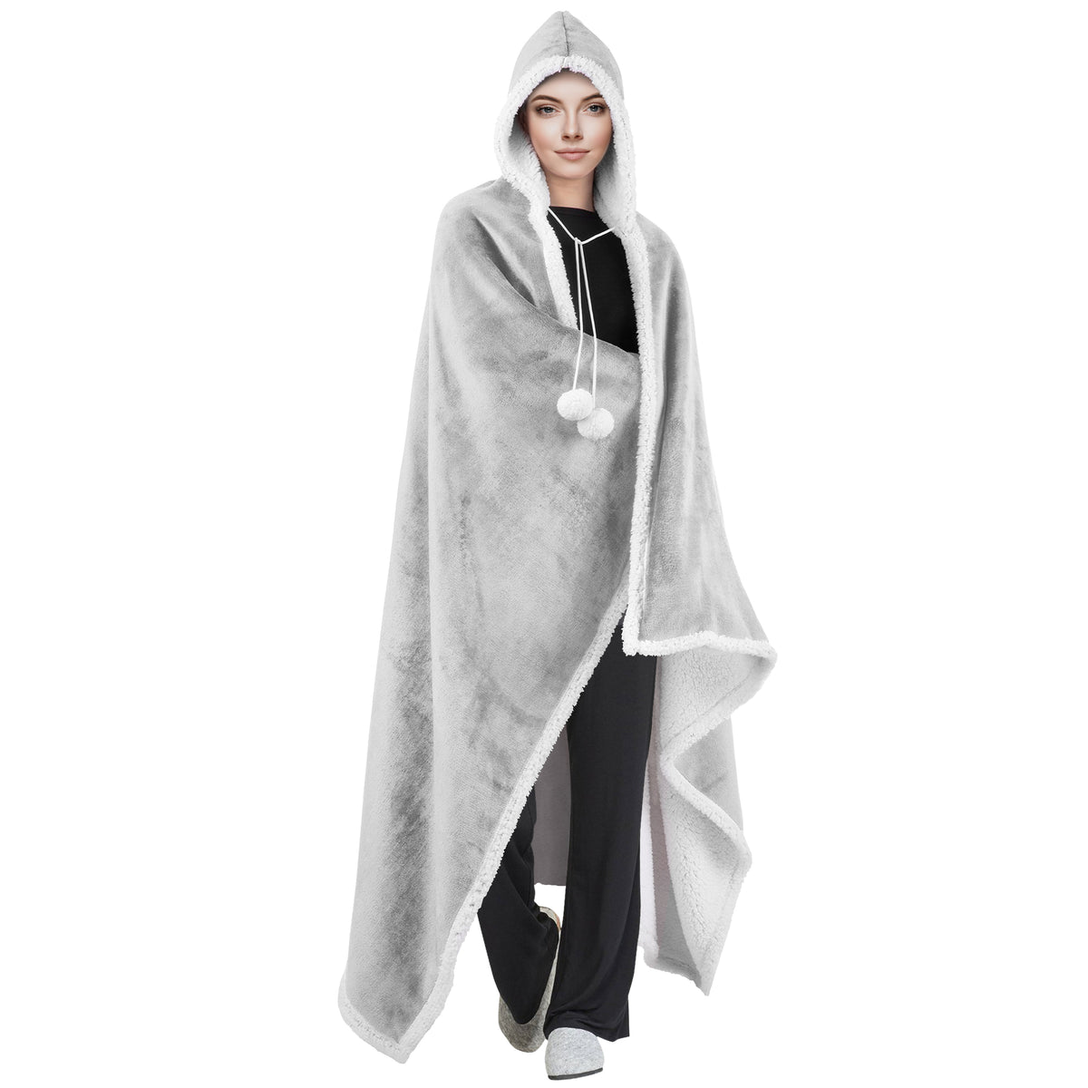 Indulge in ultimate comfort with our Velosso Pom Pom Grey Hooded Blanket. Its luxurious inner Sherpa fleece and outer flannel fabric make it perfect for anyone seeking a snuggly embrace. The super-soft and smooth texture is only enhanced by the beautiful pom-pom detailing on the hood.