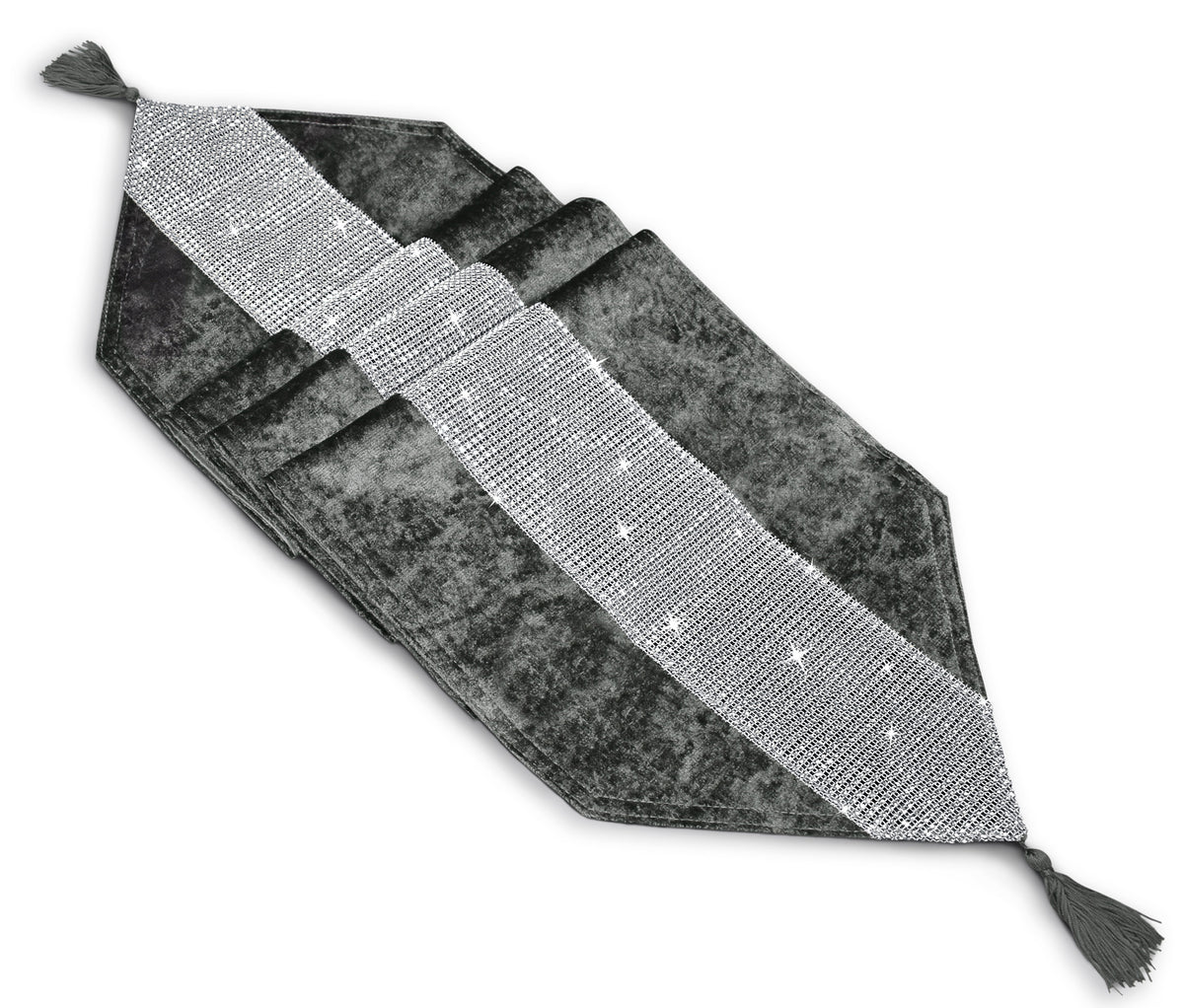 Give your dining table the perfect finishing touch with our superb quality crushed velvet table runner beautifully finished off with delicate diamantes strip across the centre. Runner size: 13" x 70" with tassle finishing.
