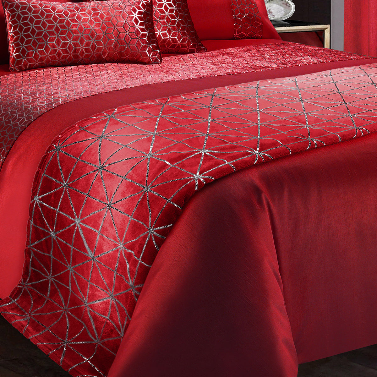 Glamorous bedding set in a luscious shade of red, with a luxury embellishment of geometric foil print design on a soft to touch and feel crushed velvet that sits on the cuff of the duvet and alongside the pillowcases that come complete with this duvet set. A really striking design that dazzles the eye and enhances your bedroom décor. The front face of this bedding is made from a faux silk fabric that has a stunning shimmer, this beautiful fabric is great for the front face of the bedding as it is crease-resistant and sits flat on your bed with little shifting, the underside is made from a super-soft polyester fabric that will keep you cosy, and comfortable for a great night’s sleep.