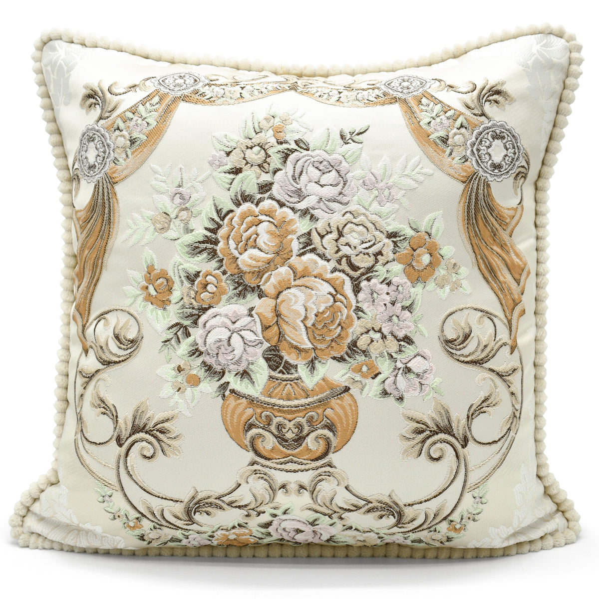 Elevate your home décor with our Velosso Jacquard Floral Vase Natural Cushion Cover. Cushions are an easy way to add colour, texture, and style to any living space. Let your room shine with this elegant and traditional cushion cover featuring a beautiful jacquard floral vase design in sophisticated natural shades, accented with stunning lace trim. Refresh your living room or bedroom décor with this luxurious cushion cover and experience the comfort and style it brings to your space.