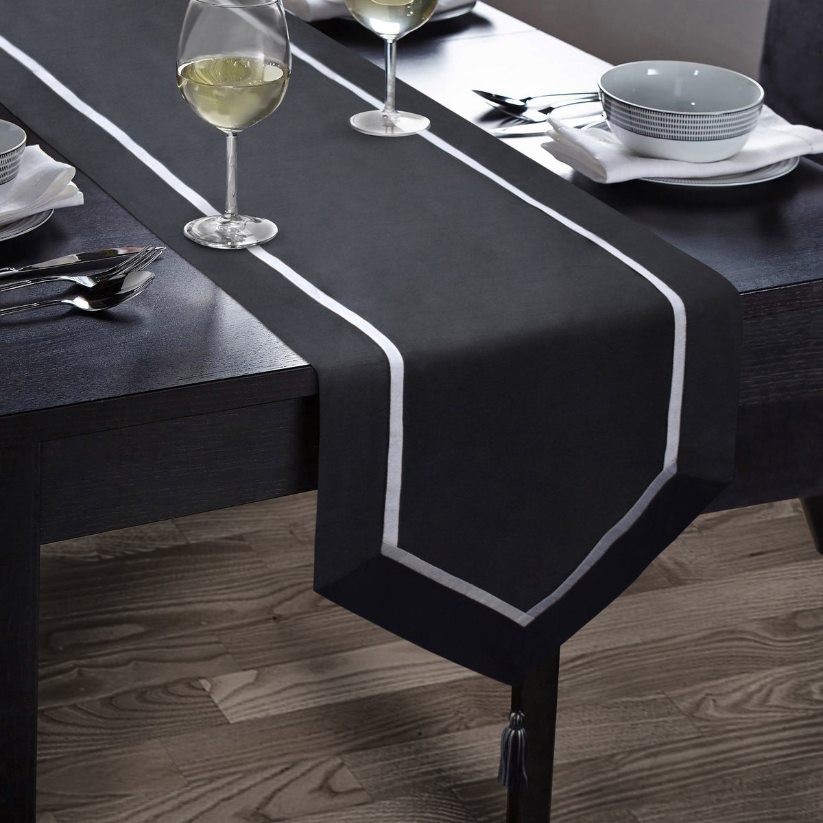 Add the finishing touch to your dining table with our Kitchen Trends Kensington Faux Silk Black Table Runner. This elegant table runner is designed to add sophistication and depth to your dining room, transforming a simple table into a statement piece.