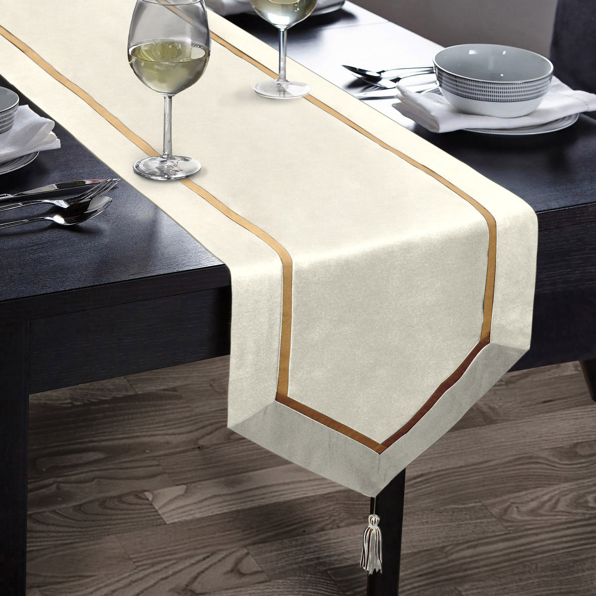 Table runners can make a simple and plain table look transformed, table runners add sophistication, depth and a sense of style to your table decor. Have this gorgeous table runner incorporated into your table decor, you can add placemats, napkins, napkin rings, and your favourite crockery. Our cream table runner is made from quality faux silk, which has a beautiful gold accent inner border and completed with stylish tassels on either side of the runner.