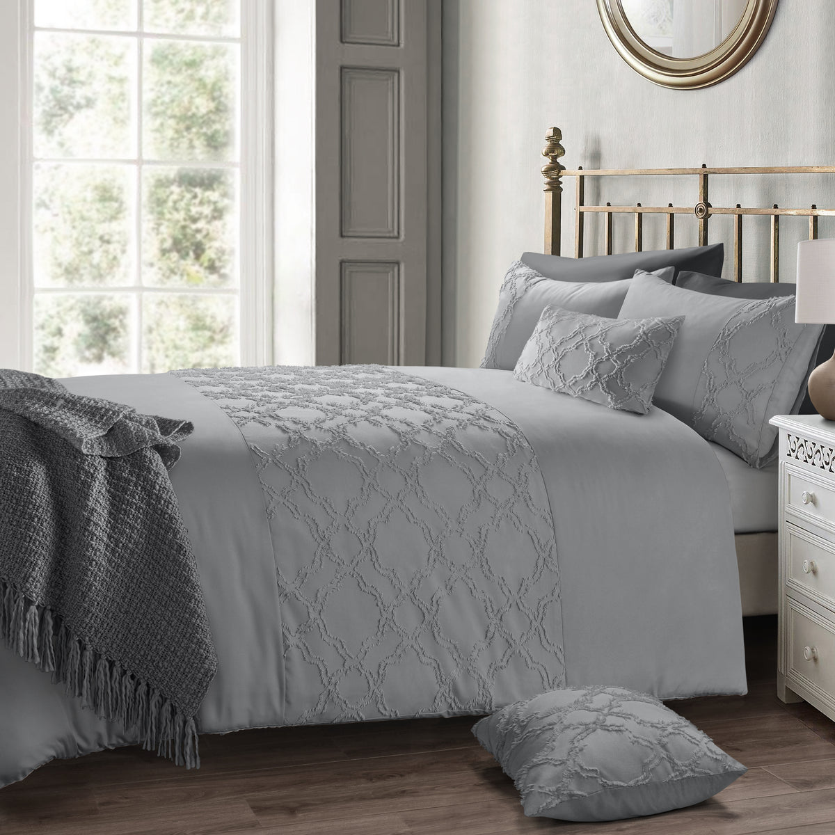 Experience the beauty and luxury of our Intimates Kiera Tufted Grey Duvet Cover & Pillowcase Set, the perfect addition to your bedroom. Made from premium quality materials, this grey set provides comfort, durability, and elegance. The tufted lattice border design adds an eye-catching detail to your bedding ensemble, providing a textured and dimensional effect for a sophisticated look.