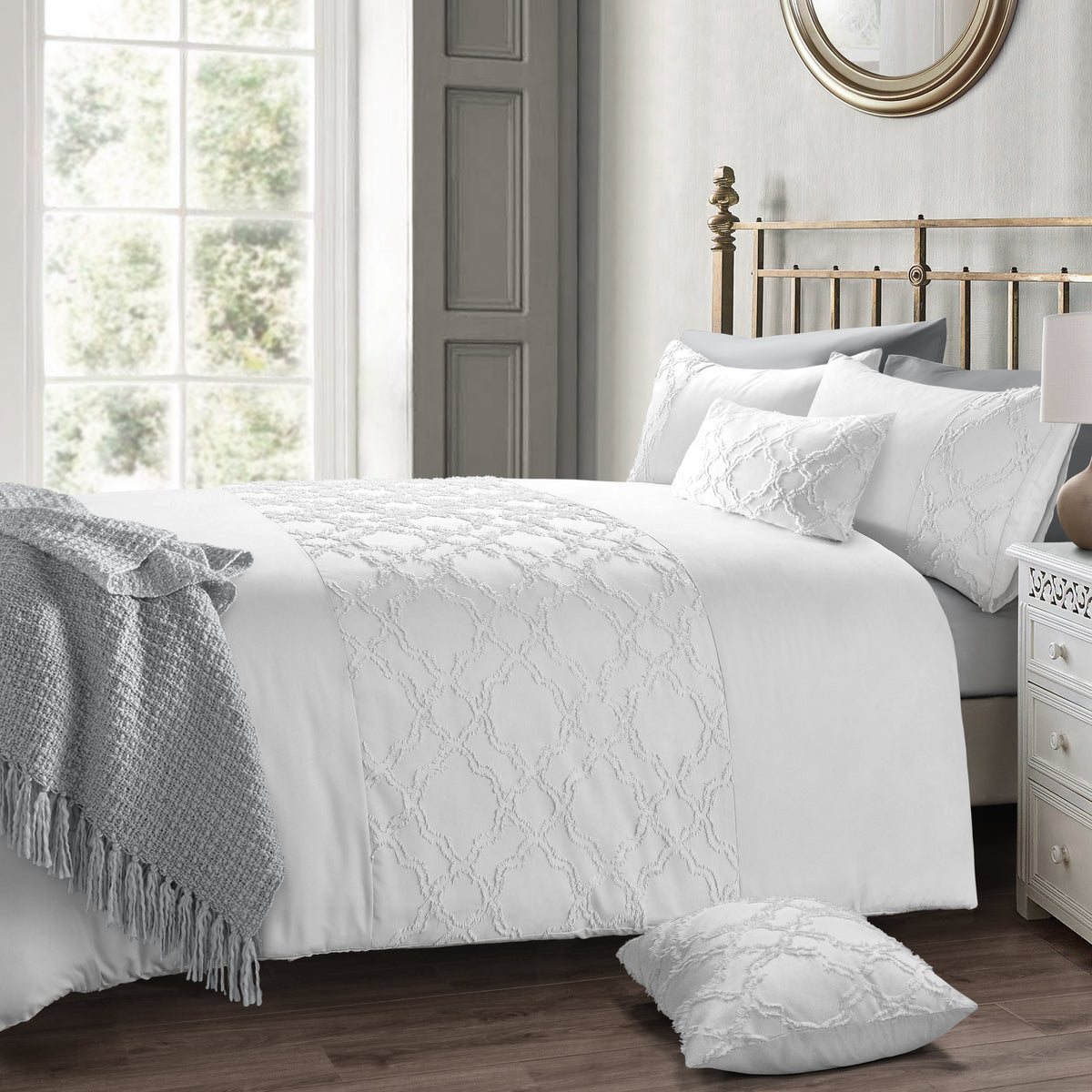 Experience the beauty and luxury of our Intimates Kiera Tufted White Duvet Cover & Pillowcase Set, the perfect addition to your bedroom. Made from premium quality materials, this white set provides comfort, durability, and elegance. The tufted lattice border design adds an eye-catching detail to your bedding ensemble, providing a textured and dimensional effect for a sophisticated look.