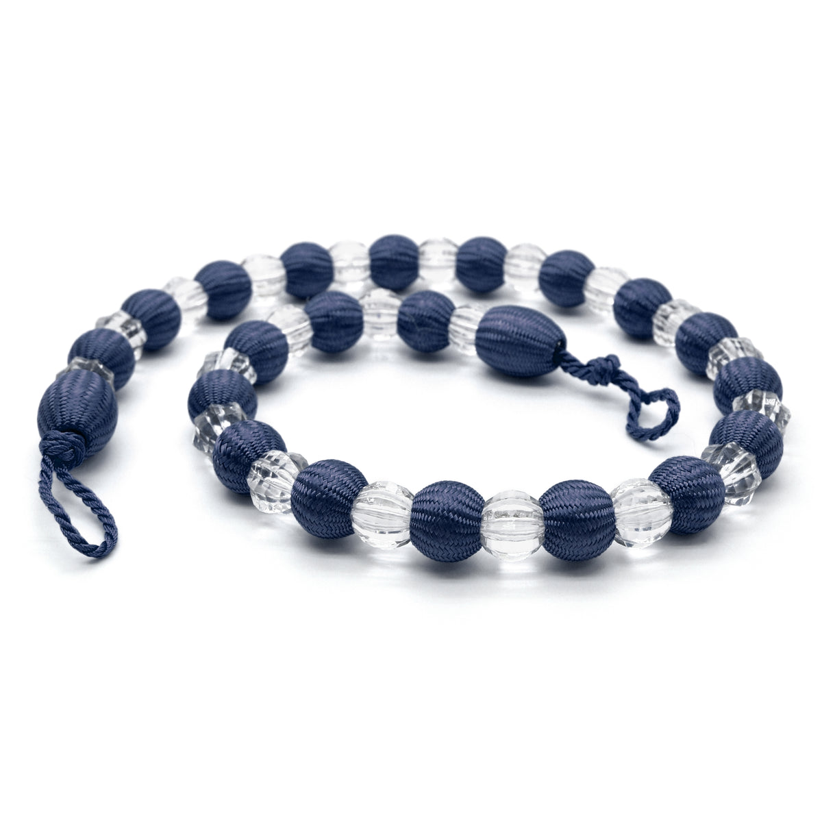 Our beaded curtain tiebacks are stunning and meticulously crafted with intricate detailing. Each tieback features a beautiful crystal followed by a knitted bead, creating a mesmerising effect that catches the eye. The clear crystals complement the navy coloured knitted beads, giving a touch of elegance to any room. Plus, the thin rope fastening makes it easy to use and secure.
