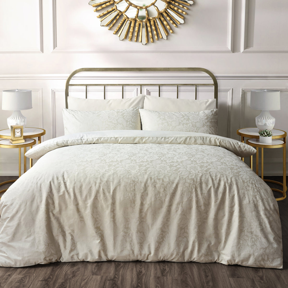 Transform your bedroom into a luxurious and elegant retreat with this prestigious damask duvet cover set. Featuring a traditional design of floral garlands in a flock print technique, this bedding boasts an exquisite high sheen that will shimmer and sparkle in natural light. The matching pillowcases complete the look, while the luxury tone of the bedding will complement any décor. Timeless and classic, this duvet cover set is made from a soft, breathable microfibre for quality and comfort.