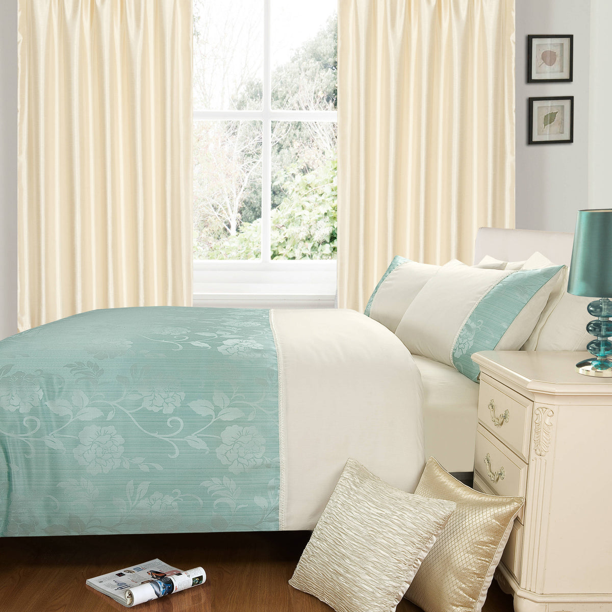 Bring sophistication and elegance to your bedroom with our Intimates Lina Jacquard Teal Duvet Cover and Pillowcase Set. The beautiful shade of duck egg serves as the perfect backdrop for the intricate design of large flowers, stems, and leaves woven into the faux silk fabric. The pretty lace trim, coiled, intertwined, and soft to the touch, separates the two colours of duck egg and white. The same theme is carried over to the pillowcases, which feature panels of teal on each side with the dominant colour being white.