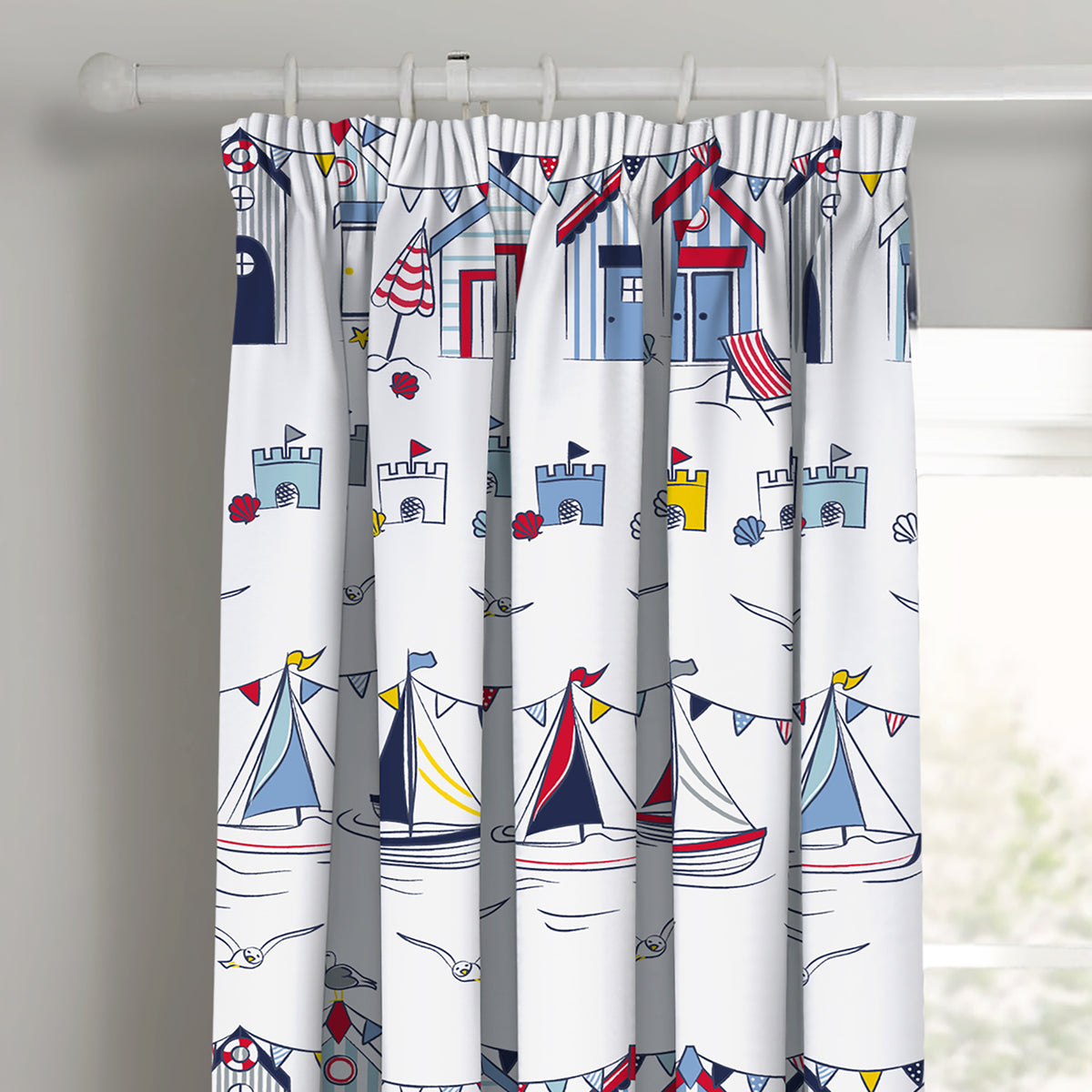 Looking to refresh your home with a seaside theme? Look no further than our Velosso Nautical Seaside Pencil Pleat Curtains. Transform your bedroom into a coastal oasis with this elaborate design that features everything you love about the beach. From pretty bunting in shades of royal blue, white, and red to floating boats, flying seagulls, rows of beach huts, and red deck chairs with umbrellas, this design is full of seaside charm. Scattered sandcastles and seashells complete the look, making it a happy place to be.