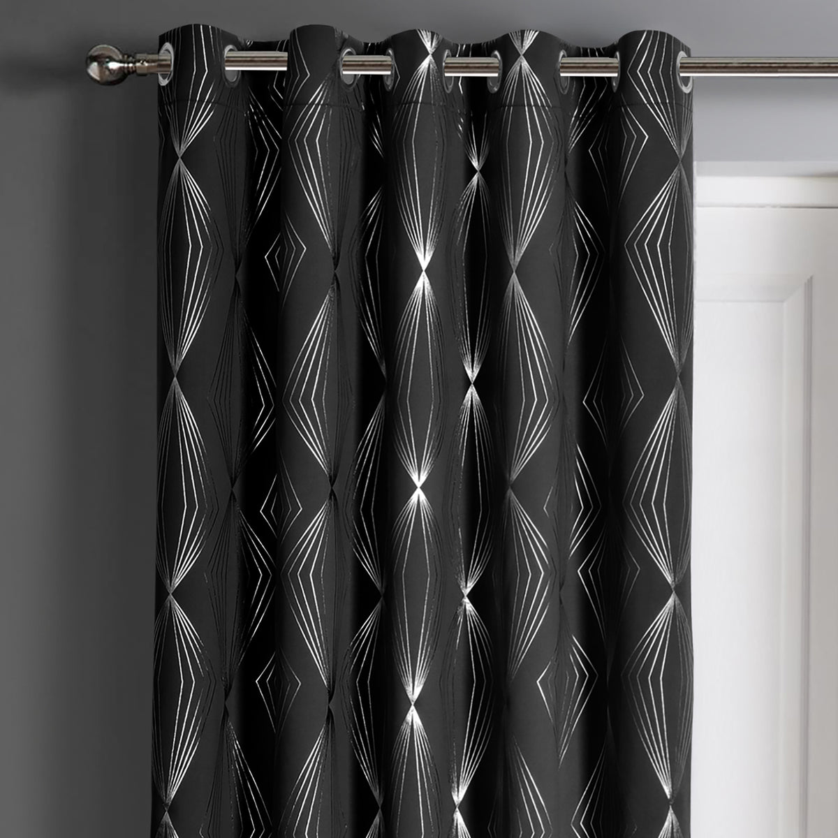 Refresh your home for less with our Velosso Onyx Black Blackout Eyelet Door Curtain. This ready-made curtain panel features a sleek black colour and a striking, modern silver geometric print on the fabric, making it a stylish addition to any room. The 3-layer blackout construction ensures that it reduces noise and eliminates draughts, while the easy-to-install eyelet header design makes hanging a breeze. This single door curtain panel is machine washable, ensuring effortless maintenance. Get ready to enjoy a restful and comfortable space with this blackout door curtain.