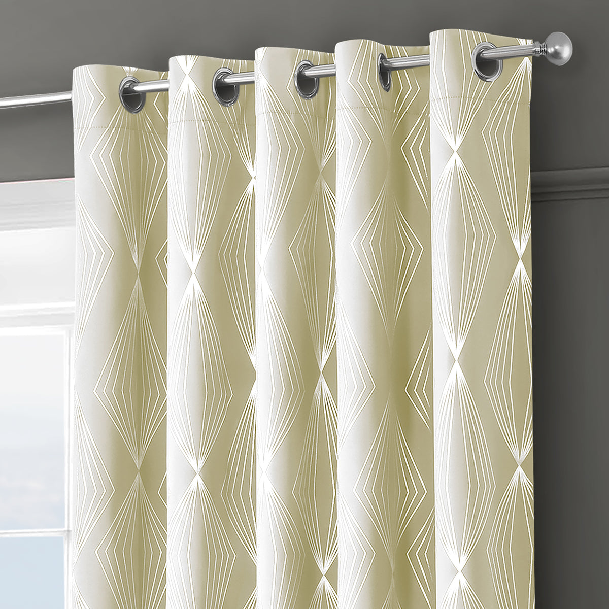 Transform your home with our Velosso Onyx Cream Ready Made Thermal Eyelet Curtains, and add a touch of glamour and style to your room. The curtains have a beautiful cream backdrop with a striking silver geometric foil print that spans across the entire width of the curtains. Made from high-quality polyester fabric, these curtains are perfect for both practicality and aesthetics. Featuring an easy-to-install chrome eyelet header, these curtains can be effortlessly hung on your curtain pole to create beautiful folds and structure. The curtains drape gracefully, giving your room a sophisticated and polished look. With their thermal properties, these curtains are perfect for keeping your room warm in the winter and cool in the summer.