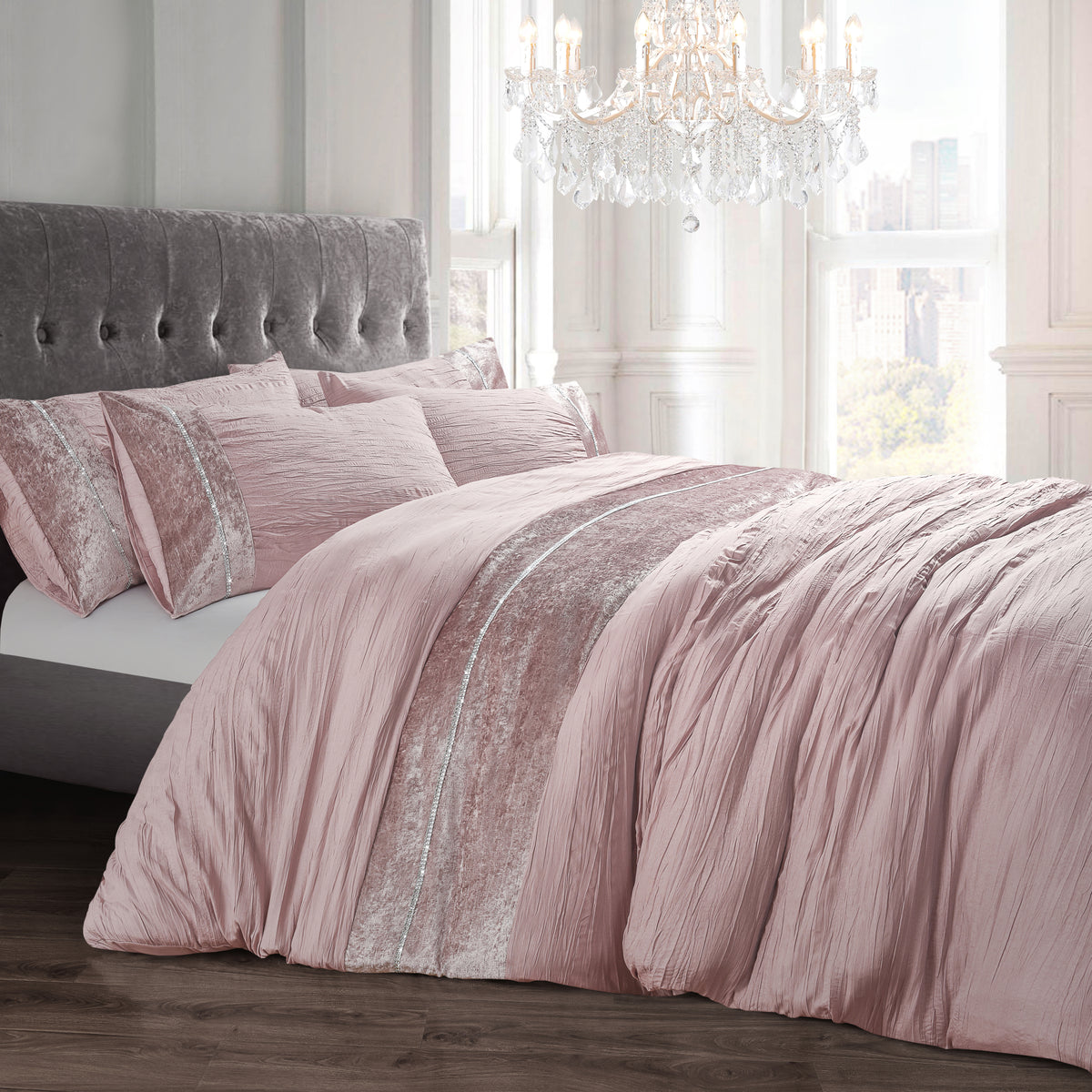 Turn your bedroom into a luxury space with our Velosso Orleans Diamante Blush Pink Duvet Cover and Pillowcase Set. With its sumptuous blush pink hue and featuring dazzling diamante embellishment, this crushed velvet duvet cover is sure to make a statement.