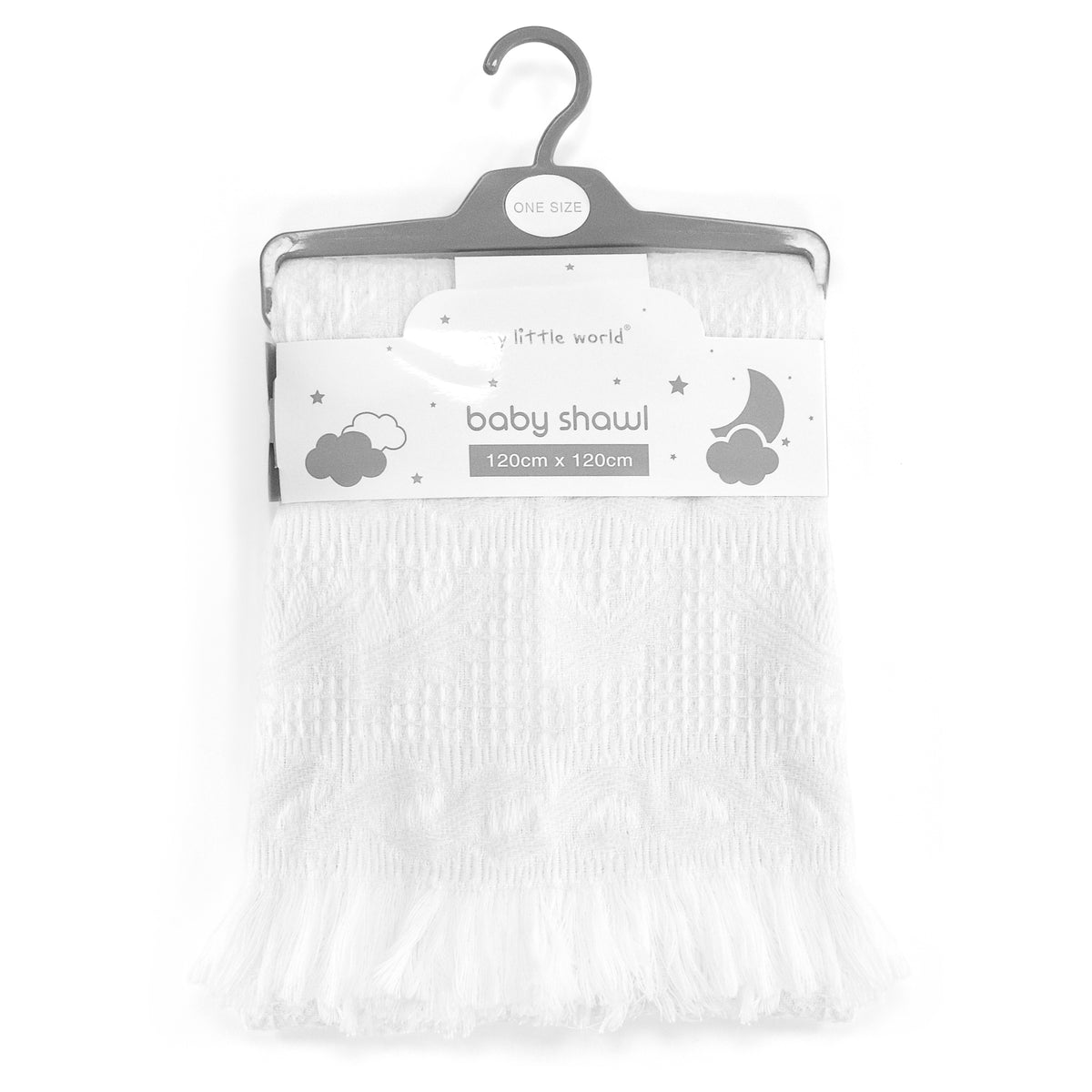 A plain white waffle print design on this soft and snug baby shawl, a pretty detailing of white tassels all around the shawl. Have your baby wrapped up warm in this cosy shawl.
