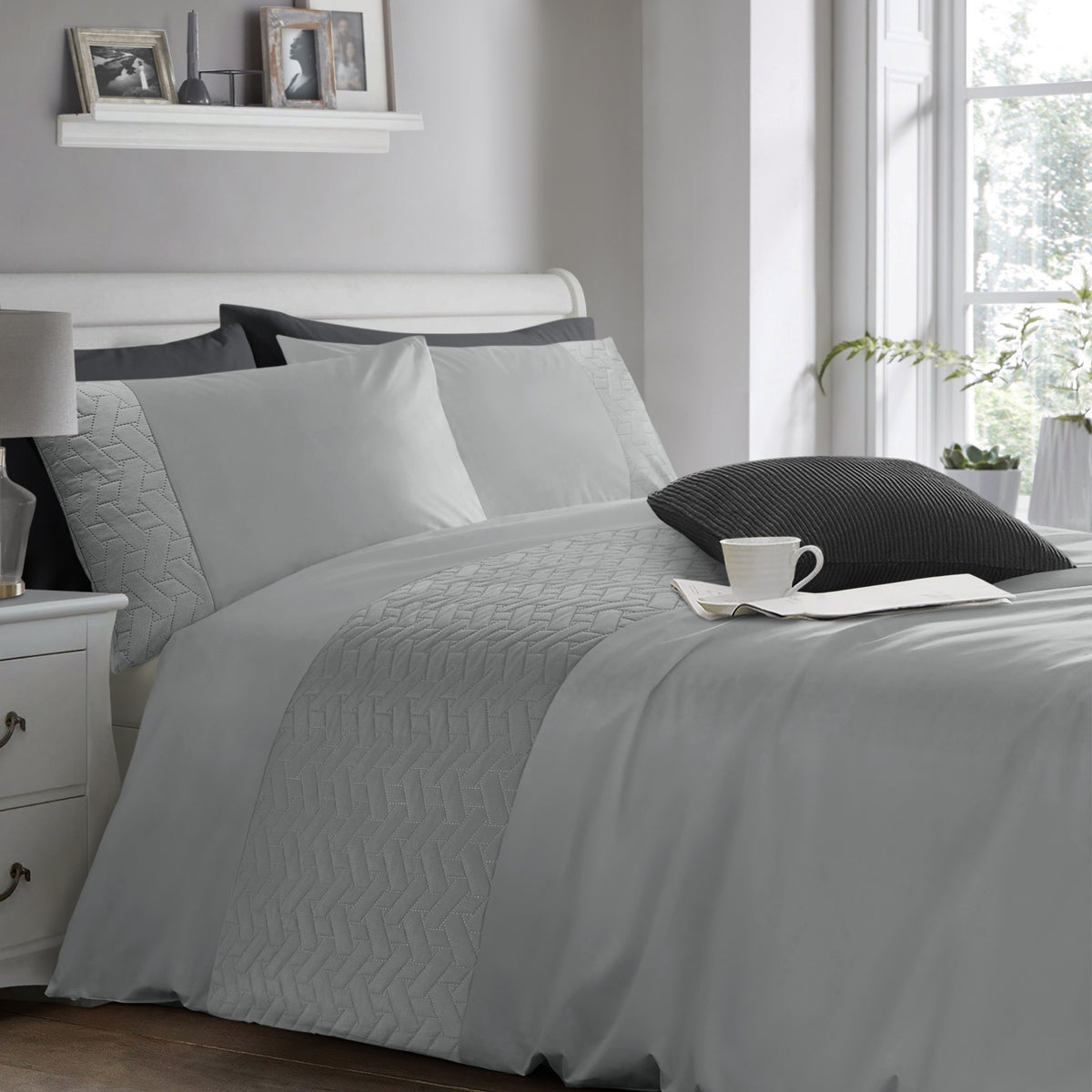 Made from microfibre fabric with its natural hypo-allergenic properties, this quilted duvet cover set is the perfect choice for those who suffer from allergies and for young children. Featuring a dazzling shade of silver and a striking pin sonic geometric quilted panel running horizontally, this duvet cover set adds a touch of modern elegance to any bedroom. The same stunning design is replicated on the sides of the pillowcases for a cohesive look that will elevate your bedding game.