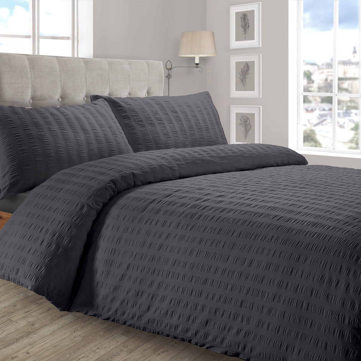 Crafted from a high-quality polycotton blend, our charcoal seersucker duvet cover set is designed to be functional and fuss-free, making it a go-to choice for any time of year. Thanks to the unique combination of fabrics, this duvet is both cool and fresh, yet also holds in heat for those chillier nights. Our duvet cover set is super soft and smooth, thanks to the cotton blend, and it's fade-resistant too. So, no matter how often you use it, your bedding will always look brand new.