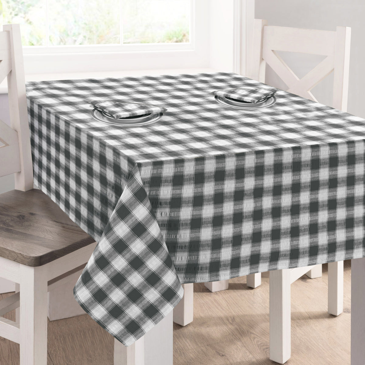 Elevate your dining experience with our Kitchen Trends Luxury Seersucker Grey Tablecloth. The checked seersucker design is crafted from a premium polycotton blend. The beautiful grey and white tones add a touch of elegance and sophistication to your dining room, making it perfect for both formal dinners and casual get-togethers.