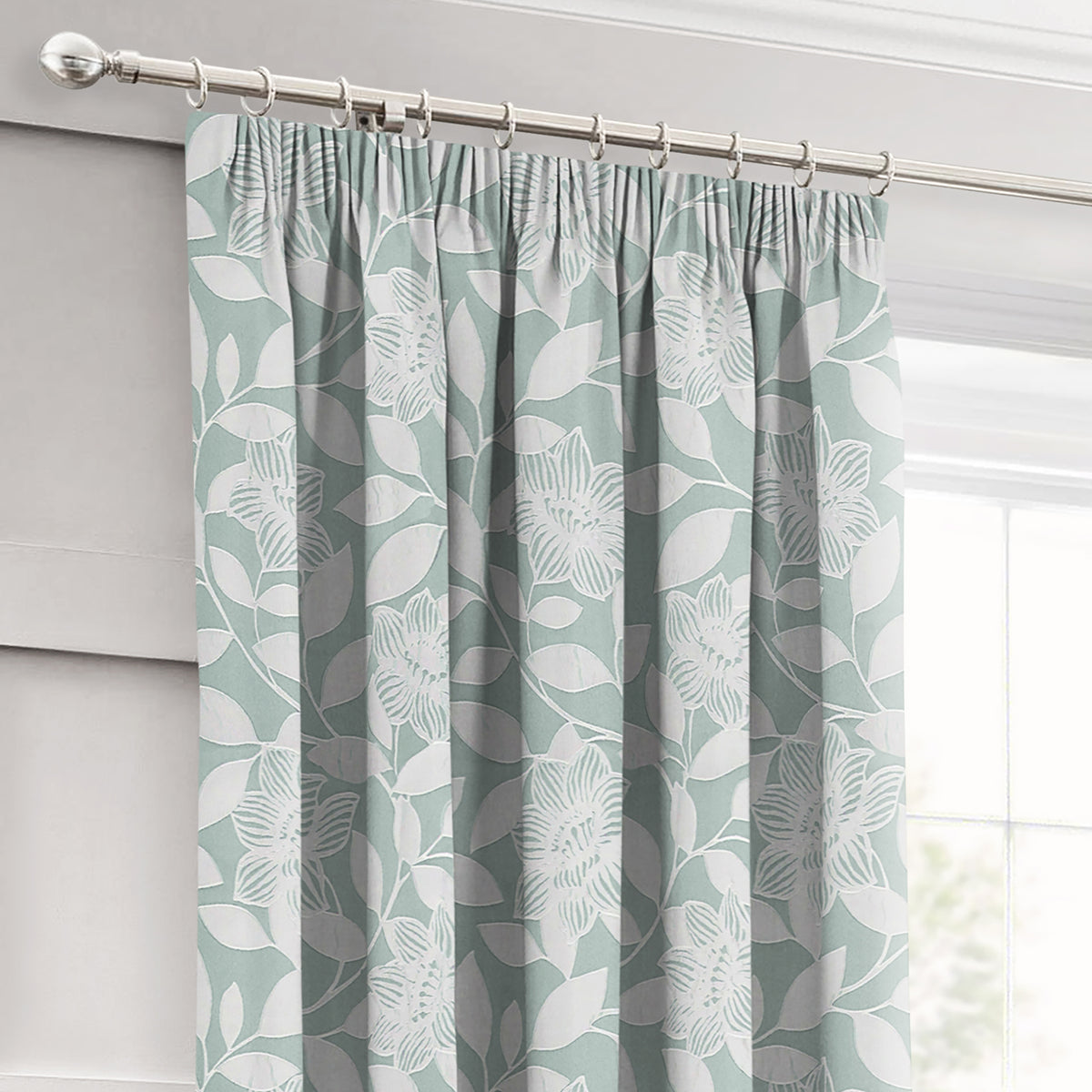 Revamp your home on a budget with our Intimates Serena Duck Egg Pencil Pleat Curtains. Adorn your windows with these beautiful, light and airy curtains that feature a contemporary floral jacquard print, with their duck egg shade adding a pop of colour and style to your room décor. The intricate stitching around the leaves pattern adds depth and texture to the curtains.